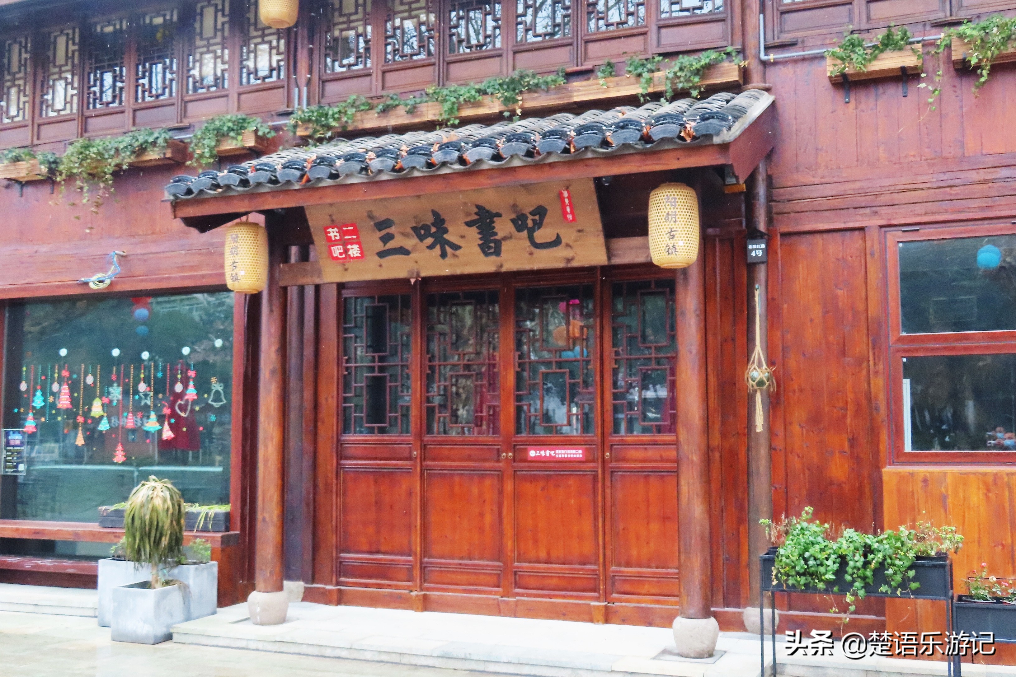 和这些室外餐桌一样冷清的,就是隔了一条街的那排房子了,这里也是阳明古镇的主体。这些房子都是一些店铺,有书店、餐吧、糖坊、面馆、居酒屋、美术馆等,种类还是不少的。沿江的街上没有什么人,店铺自然也就生意,店老板们大都在自顾自地忙。