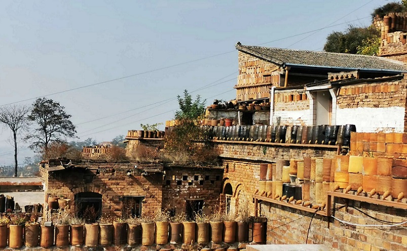 在这里,人们用陶瓷砌墙、铺路、造房子,还有坛子建的烟囱,陶片绘制的艺术画,甚至许多材料都是坛坛罐罐破碎后产生的废品。古镇的房屋沿着群山而建,层层叠叠,一排套着一排,经常会出现邻家的屋顶是自家的院子,那场景就像油画一样充满立体感。