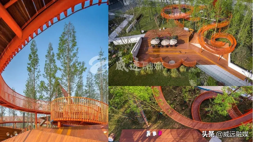 内结高低起伏的地形,设置旋转步道联系立体步行交通体系,通过旋转步道造型的设置,打造为区内一处具有代表性的网红打卡地。