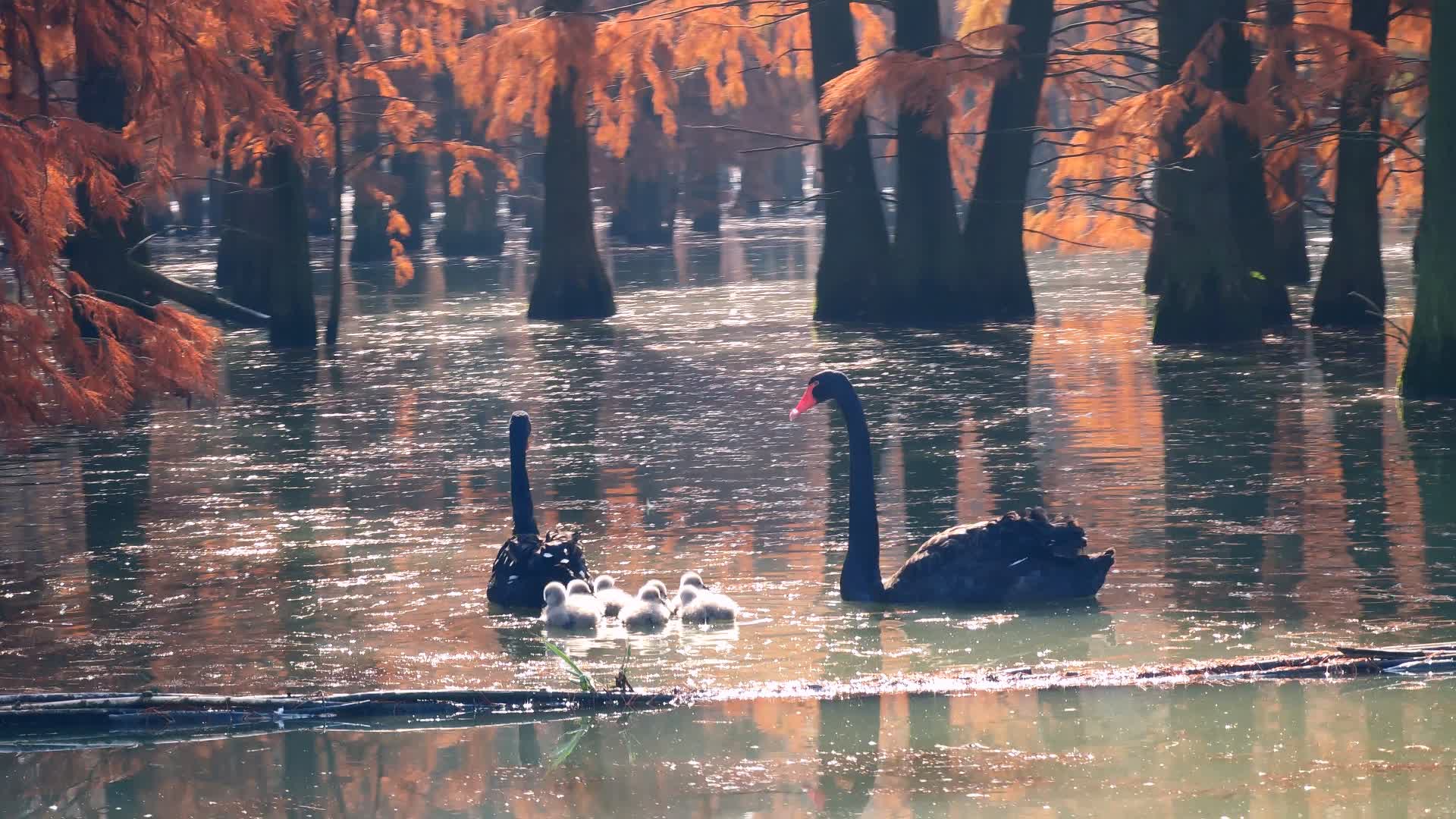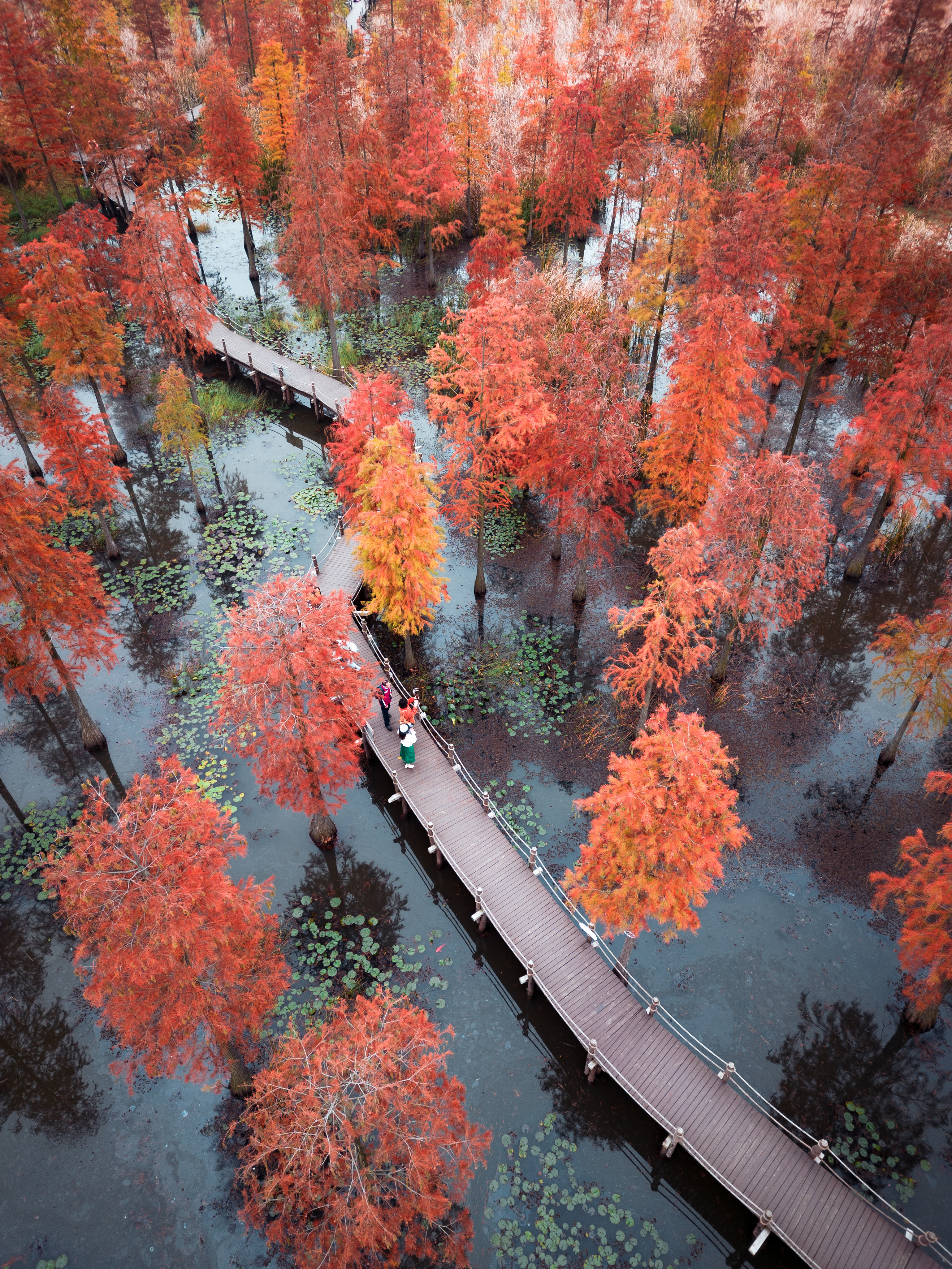 一大早,明丽的阳光洒入池杉林,踩着木栈桥,融入林中的五光十色。池杉在初冬季节颜色正由黄绿向赭红转变,待到完全变成铁锈红,树叶开始脱落。池杉林的水面下又是另一个生机勃勃的生态圈。造型优美的睡莲依然盛开,一群一群锦鲤在水里遨游,泛起轻微的涟漪,反射着硬朗的光线,一闪一闪。