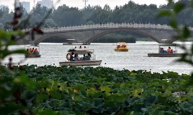马家湾公园一步一景,越往深处走,景致越纷繁精彩。公园沿着萧太后河沿河而修,两岸林木繁茂,中央河水悠悠,并以多座拱桥贯通两岸。