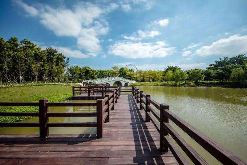 公园的步道大致上呈一个圆形,中间有一座小岛,岛上野生鸟类繁多,鸣声不断,有栈桥将步道和小岛相连。除了良好的自然风光,这里还有独特的岭南建筑,错落地分布在绿色植被之间,最适合游人在宜人的风光和古朴的民居中留影。