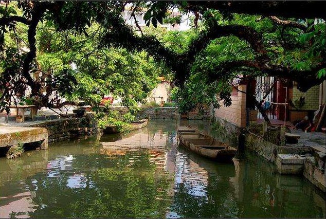 与南海神庙水陆相连的南湾水乡,以亭台楼阁、龙舟码头、秋枫古堤、小乔流水,构成了极具岭南特色的水乡风情,南湾水乡也因此被誉为“广州小周庄”。水乡还拥有着数量众多的文化遗址,以及许多充满岭南特色的古建筑群。