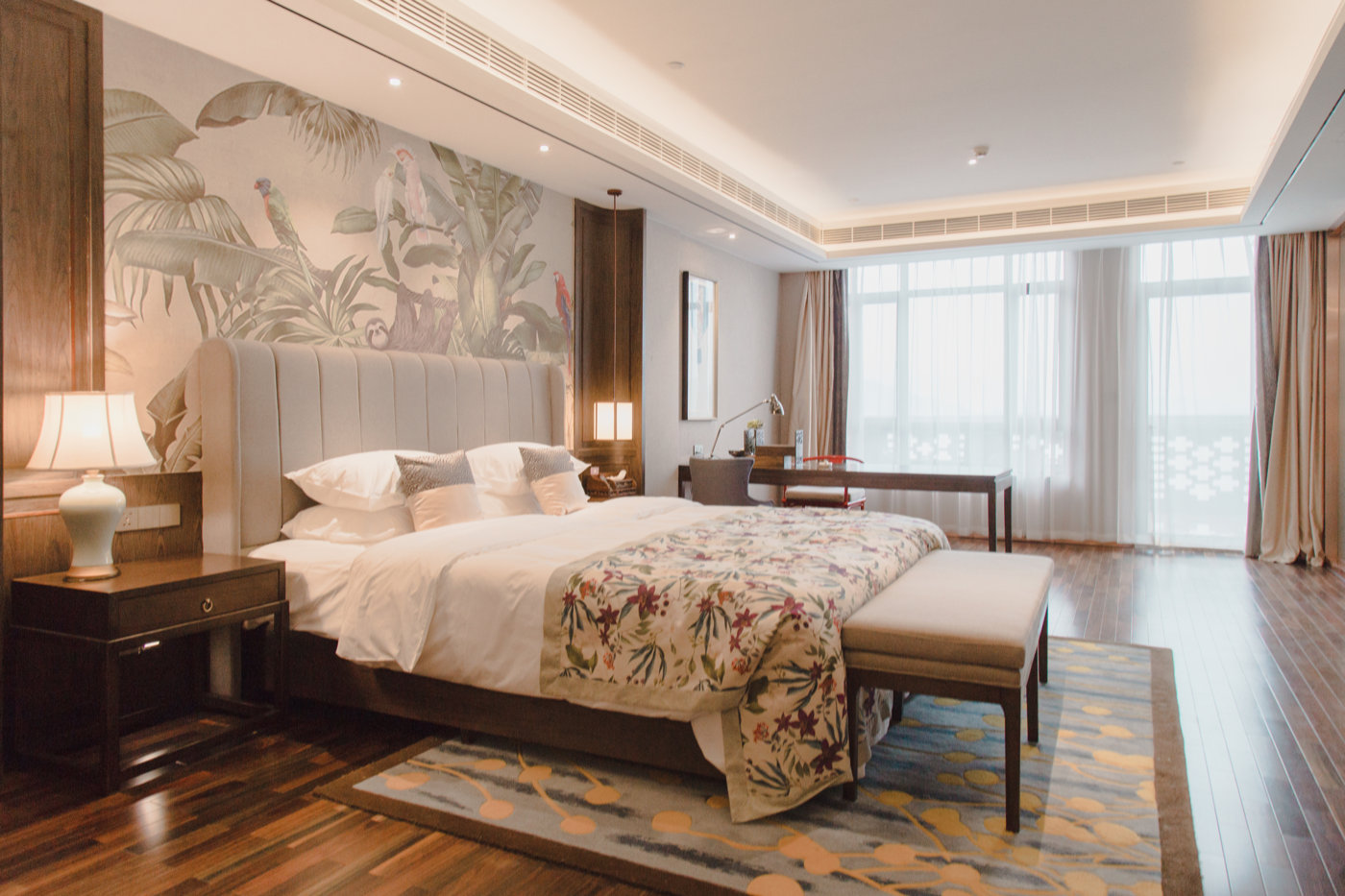 酒店坐落在达蓬山旅游度假区内,以达蓬山为屏,以窖湖为畔,大半客房临水而建,将“自然生态,天人合一”的设计理念展示得淋漓尽致,客房以中式与欧式为主格调,中式客房的寒烟翠系列的中国古典花鸟元素,简洁雅致。客厅区多数配榻榻米,不光能作为品茗阅读待客空间,还可以变身床位,非常适合全家出游,性价比极高,而且其中33套临水而建,超大的阳台更是观景的绝佳之处,搭配上豪华的按摩浴缸,躺着便能将湖光山色尽揽!