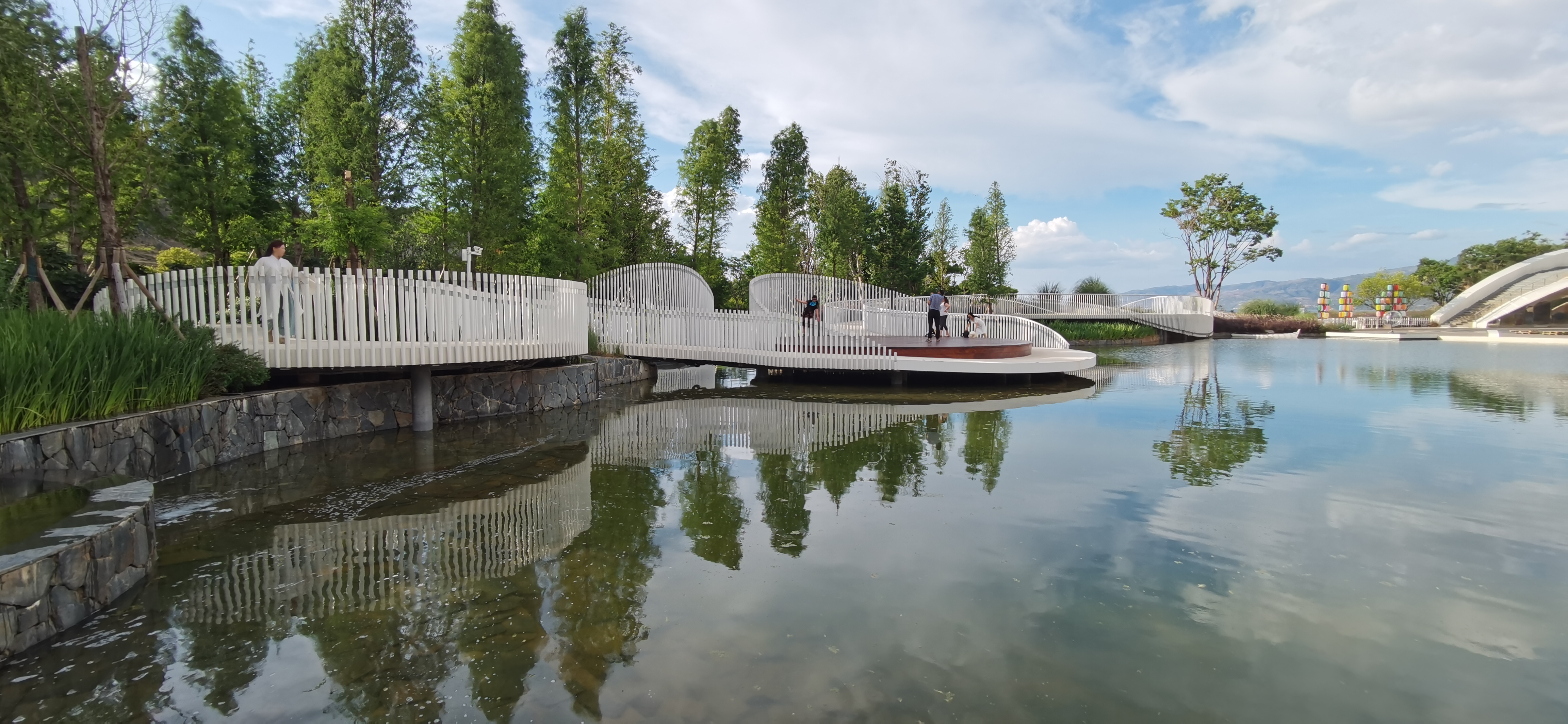 灵动是水池的灵魂,弧形的池,弧形的琴弦,弧形的跑道,让景动了起来,与音乐主题相得益彰。白云朵朵,这画面让我有点儿挪不动步。