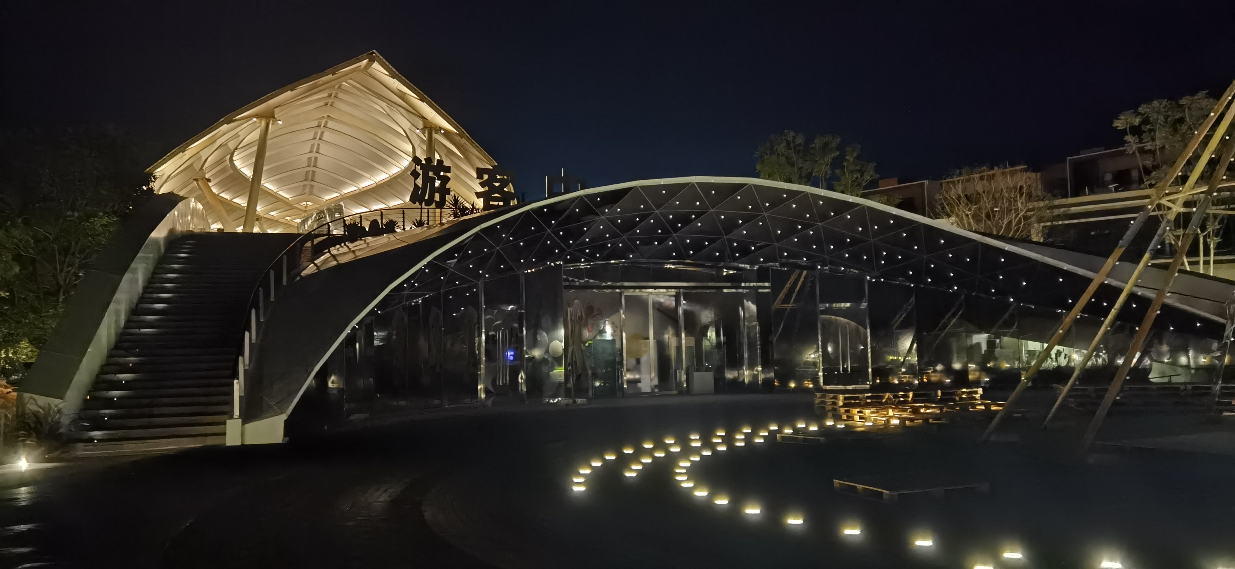 华灯初上,“星空小镇”上线了,建筑物在灯光的勾勒下,其形状更加突出。