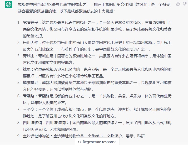 ChatGPT:成都是中国西南地区最具代表性的城市之一,拥有丰富的历史文化和自然风光,是一个备受游客喜爱的旅游目的地。以下是成都旅游必去的十大景点: