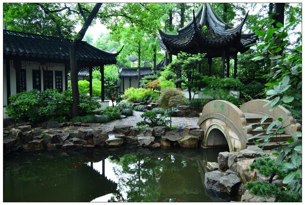荷花池,灵动多姿。该园以水见长,而园中水的灵魂就在荷花池。荷花池外通护城河,引进河水是园内弯弯曲曲水以及大大小小的水池水塘,长长短短的明沟暗渠的水源。荷花池背靠大假山,面对凝和堂、花神堂等古典建筑,左临得月轩,右带迎曦亭,曲折多变,桥岸边遍布古树名木,池水清澈明静,游鱼历历可数,其中绿叶田田,红花摇曳,荷香远溢。雨后水珠在荷叶上滚动,闪闪发光。