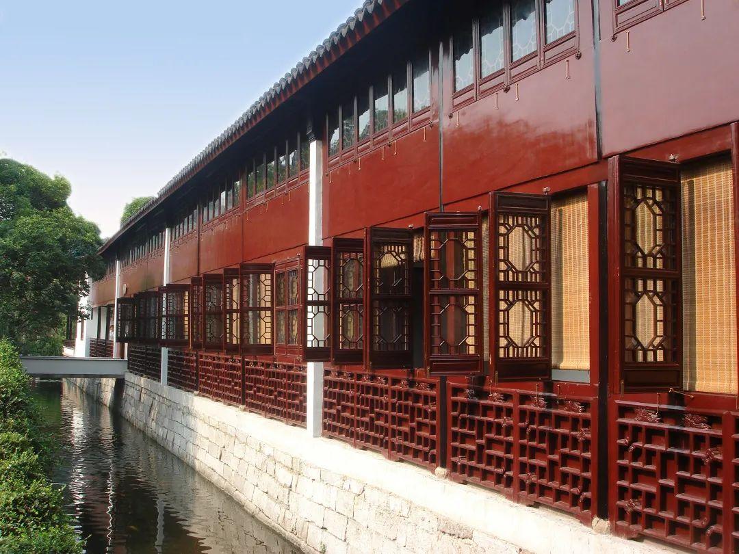 得月轩,近水楼台先得月。曲水园中的得月轩,可谓名副其实。它坐西朝东,全长60余米,为中国传统风格的砖木结构建筑,东面正对园林一致排列了84扇长窗。打开窗户便面对宽阔的湖水,当皓月当空时,身居得月轩中,一轮皎洁圆月便探手可掬。得月轩分两层,楼上楼下均为长廊。是曲水园东南古建筑景区与西北湖山自然景区的连接纽带。
