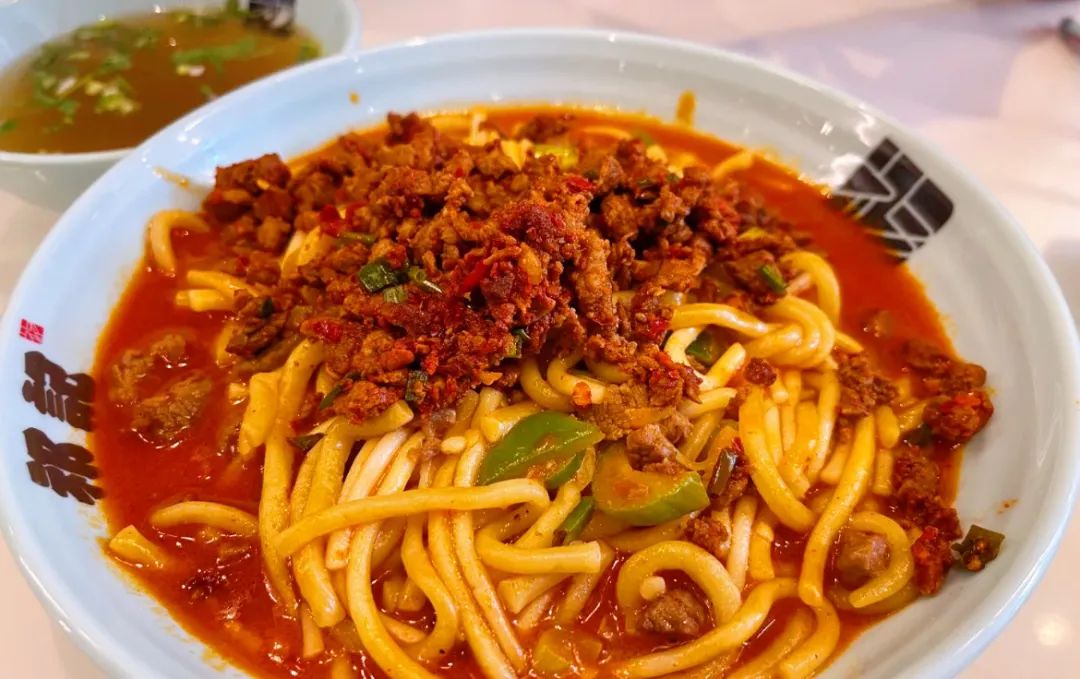 入口的羊肠面咸香十足,还带着几丝辣,别忘了一定要配上一碗羊肉汤。