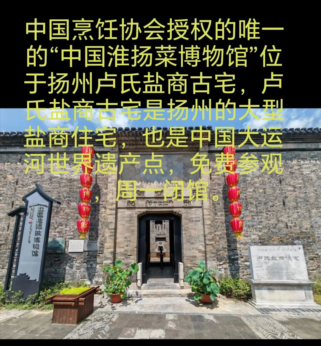 15.卢氏盐商古宅(含中国淮扬菜博物馆),卢氏盐商古宅是扬州的大型盐商古宅,是中国大运河世界遗产点,中国淮扬菜博物馆设在卢氏盐商古宅里面,是中国烹饪协会授权的唯一的中国淮扬菜博物馆,免费参观, 周一闭馆。