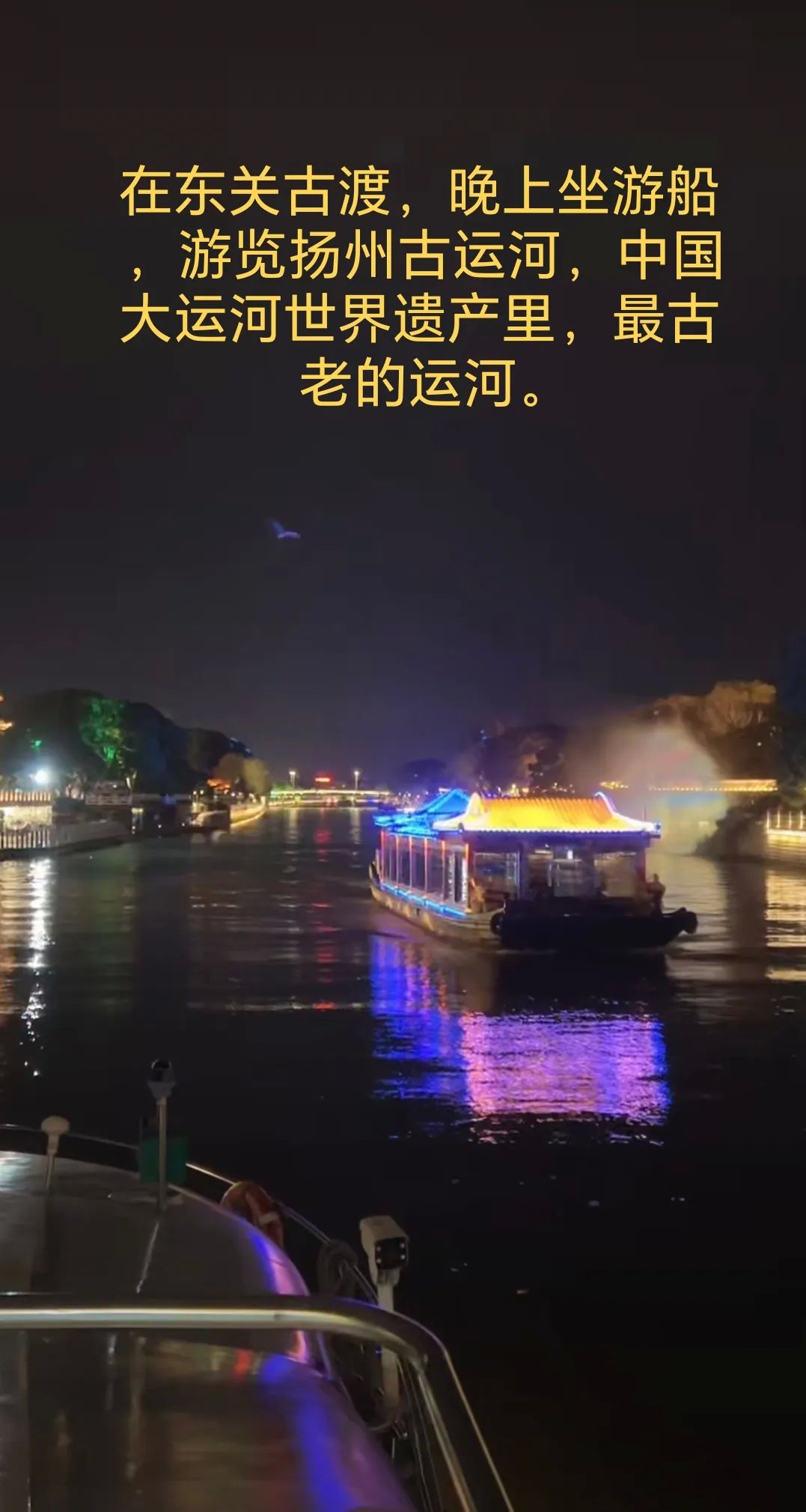 4. 古运河风光带,还可以游船夜游古运河。扬州古运河是中国大运河世界遗产中最古老的运河。