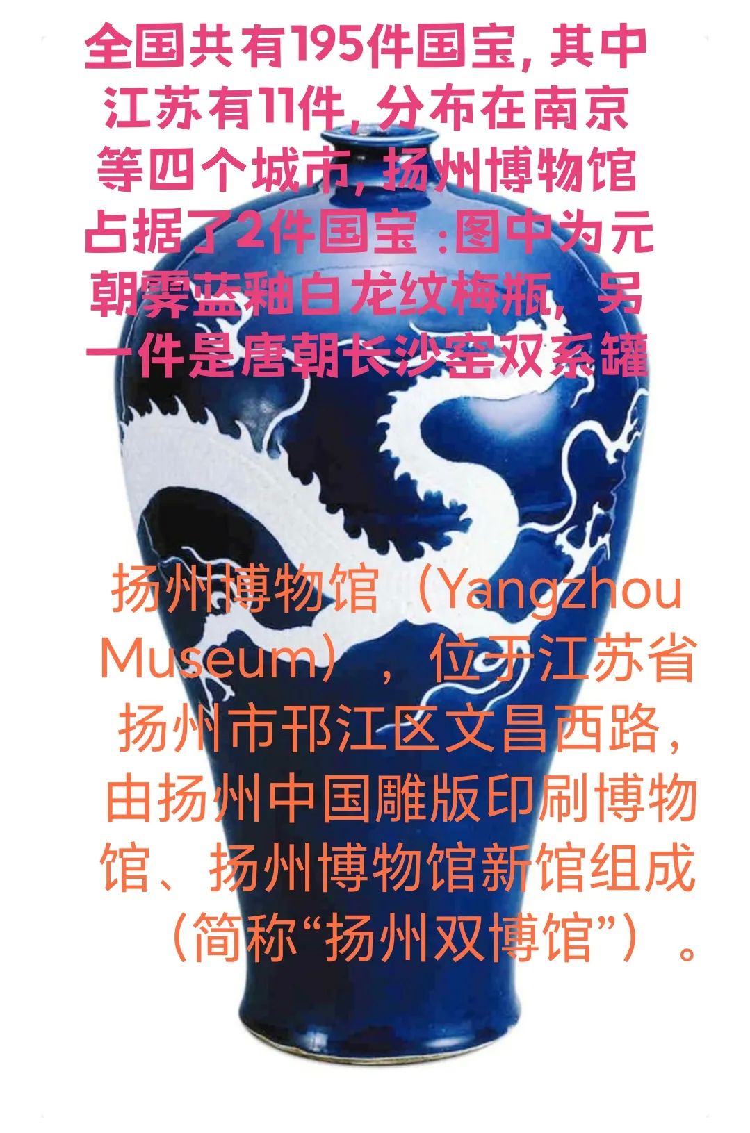 扬州博物馆有2件国宝:1. 元朝霁蓝釉白龙纹梅瓶(全世界仅有三件,扬州这个不仅是最大的,也是唯一没有破损);2.唐朝长沙窑双系罐(被誉为长沙窑之王)。