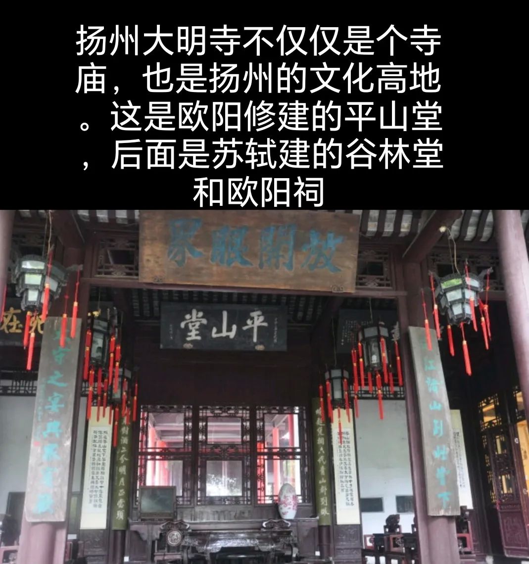 2. 大明寺(包含平山堂)。大明寺不仅是个寺庙,也是一处园林,更是扬州的文化高地,康熙乾隆下江南,来到扬州都要去平山堂。大明寺里还有鉴真纪念堂、欧阳修平山堂、苏轼谷林堂、天下第五泉、康熙和乾隆御碑亭、栖灵塔、石涛墓等景点。