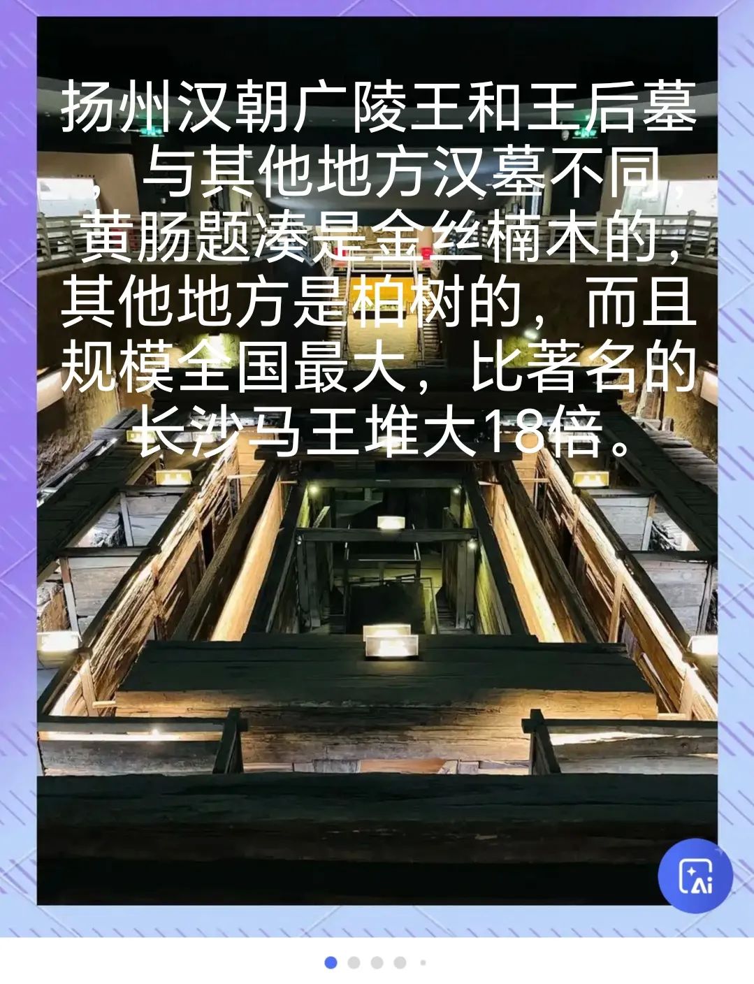 8.汉陵苑(汉朝广陵王墓和王后墓),1号地宫是广陵王墓,金丝楠木的黄肠题凑,规模全国最大,比长沙马王堆大18倍,还出土了金缕玉衣等文物。2号地宫是王后墓,也是金丝楠木的黄肠题凑,规模比广陵王墓差不多,略小一点,还出土了铜马车阵等文物。