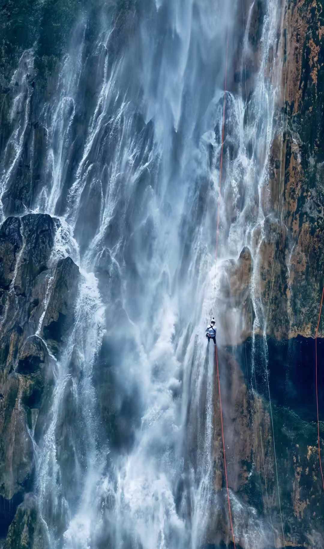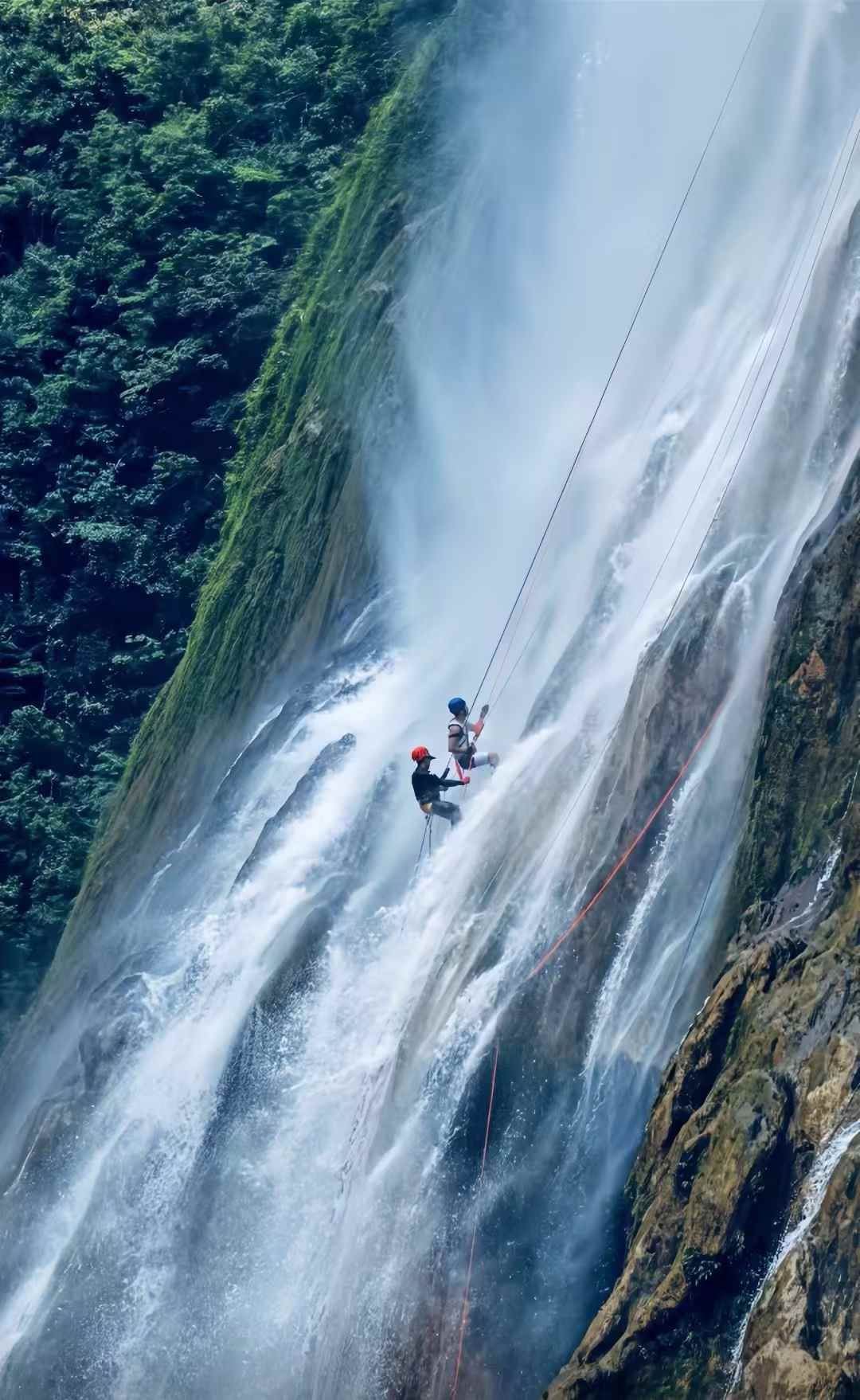 瀑降,就是沿着瀑布从高处往下降落。这项运动结合了攀岩、速降等多种技能,是一项极具挑战性的户外运动。贵州黄平野洞河景区,120米高的飞水崖瀑布飞泻而下,极具视觉冲击力和挑战性。