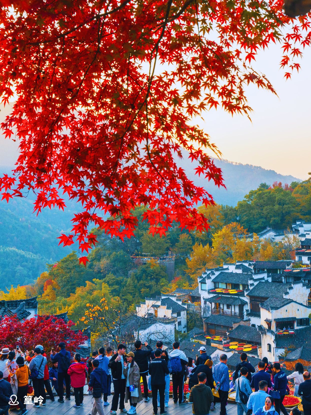 篁岭:立秋后晒秋开场,这里绝对是C位打卡地。尤其是11月,红枫凑热闹似的来串场,那画面,美到想住在这不走了