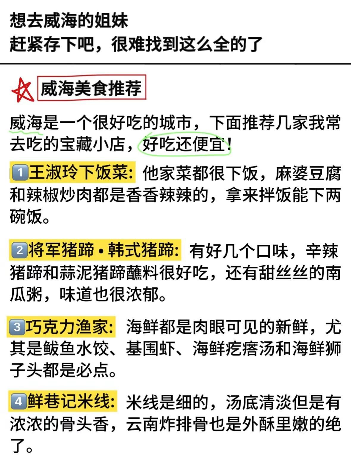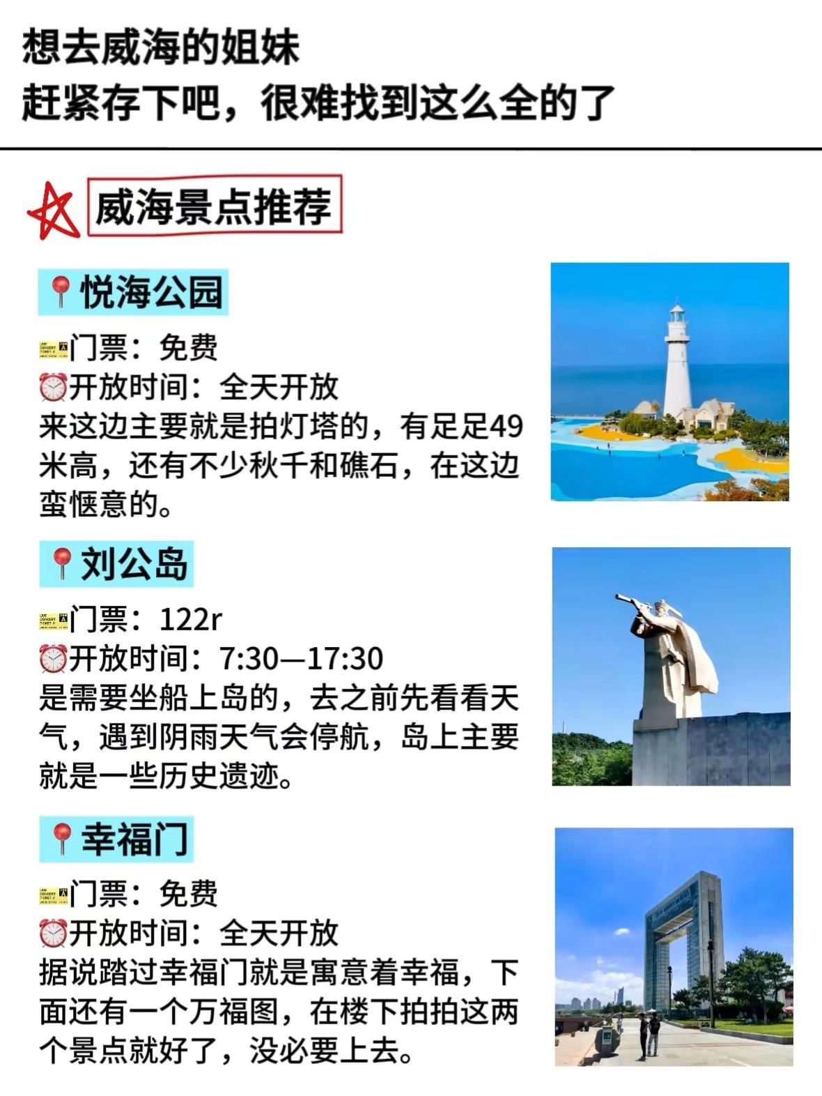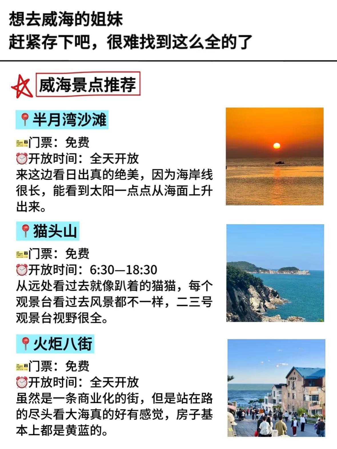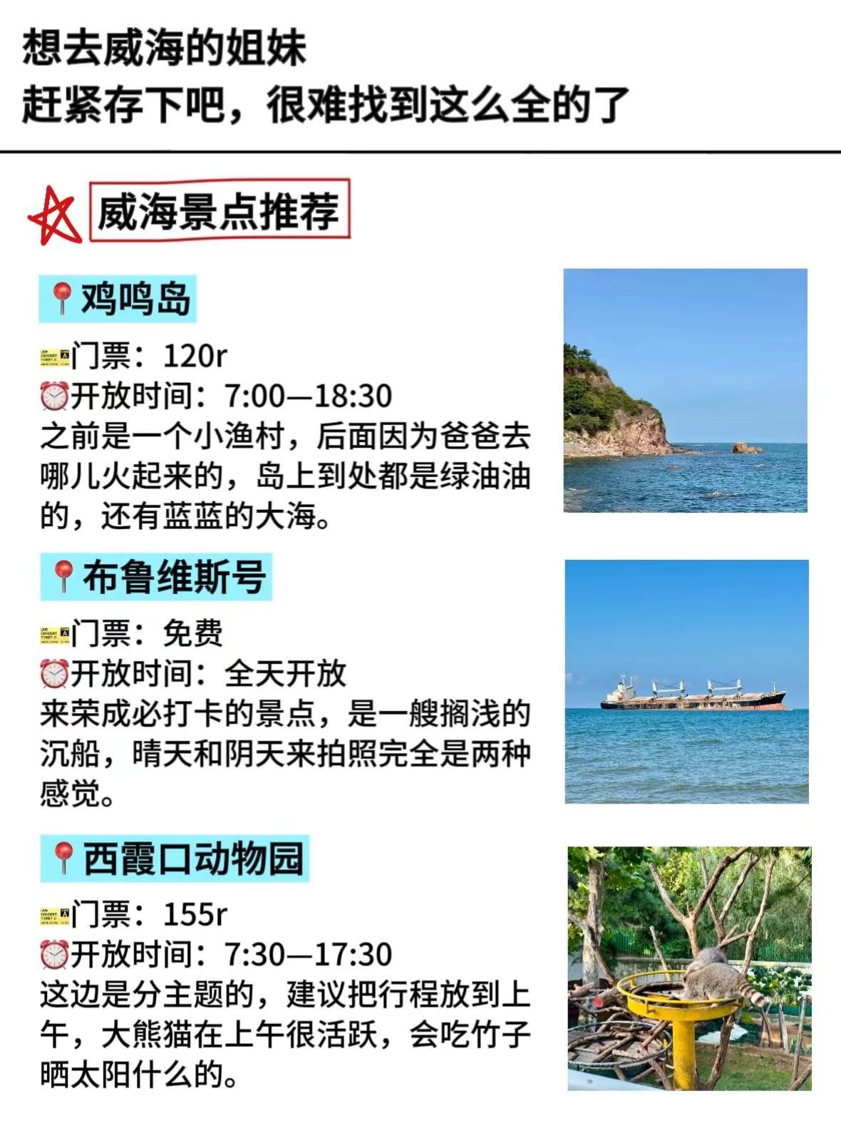 10月去威海旅游不看这篇攻略真的会哭。真的要趁着10月份温度合适去一次威海!现在的威海天气适中,景点的人也不算多,酒店也比之前便宜了好多,特意整理了这份超详细威海玩法,建议收好--【关于威海景点】悦海公园:来这边主要就是拍灯塔的,有足足49米高,还有不少秋千,在这边蛮惬意的。刘公岛:是需要坐船上岛的,去之前先看看天气,遇到阴雨天气会停航,岛上主要就是一些历史遗迹。幸福门:据说踏过幸福门就是寓意着幸福,下面还有一个万福图,在楼下拍拍这两个景点就好了,没必要上去。半月湾沙滩:来这边看日出真的绝美,因为海岸线很长,能看到太阳一点点从海面上升出来。猫头山:从远处看过去就像一只趴着的猫猫,每个观景台看过去风景都不一样,二三号观景台视野很全。火炬八街:虽然是一条商业化的街,但是站在路的尽头看大海真的好有感觉,房子基本上都是黄蓝的。鸡鸣岛:之前是一个小渔村,后面因为爸爸去哪儿火起来的,岛上到处都是绿油油的,还有蓝蓝的大海。布鲁维斯号:来荣成必打卡的景点,是一艘搁浅的沉船,晴天和阴天来拍照完全是两种感觉。西霞口动物园:这边是分主题的,建议把行程放到上午,大熊猫在上午很活跃,会吃竹子晒太阳什么的。#威海攻略 #威海 #威海旅游攻略 #山东威海 #威海网红打卡地