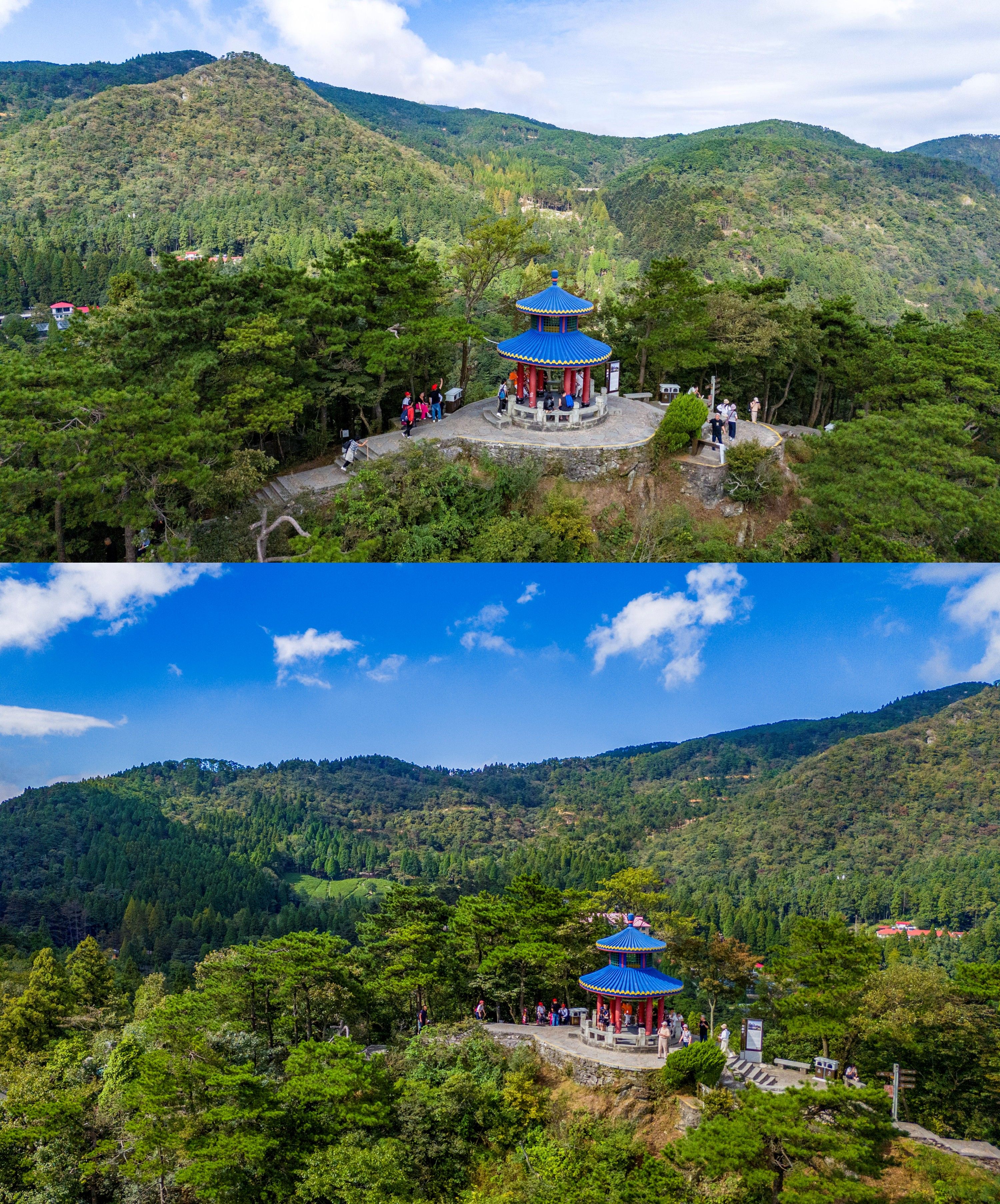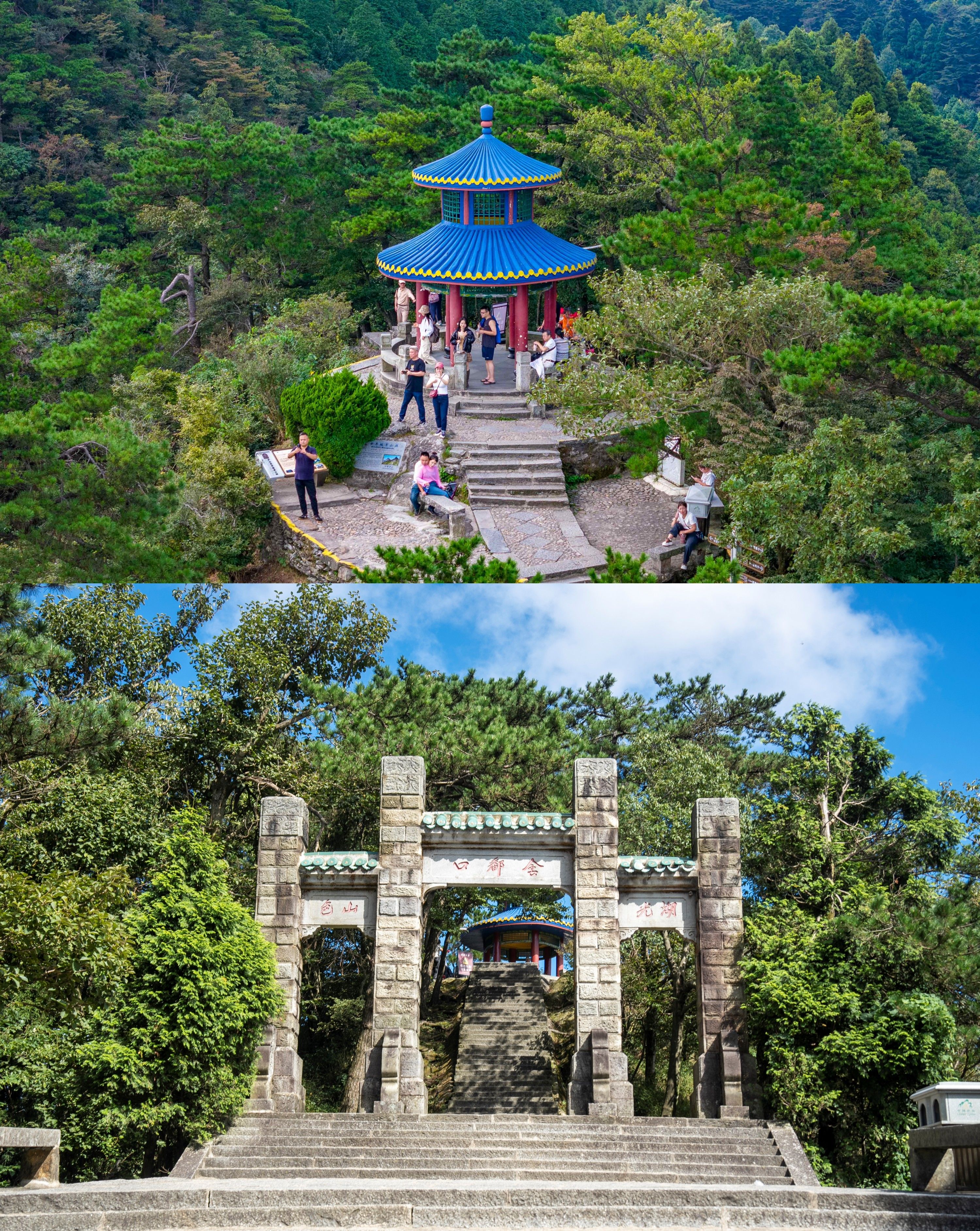 岭上的含鄱亭、望鄱亭等建筑隐现林间
