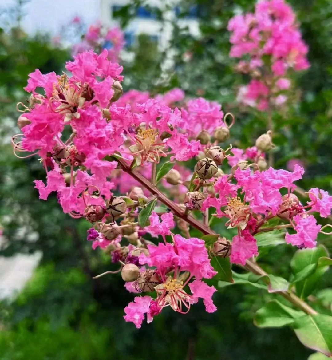 沿着亲水步道漫步,像是闯进了夏日的秘密花园。道旁的紫薇开得正艳,粉紫、火红的花瓣缀满枝头,风一吹便簌簌落下;不知名的小蓝花、小黄花藏在草丛里,不经意间就撞进视线。
