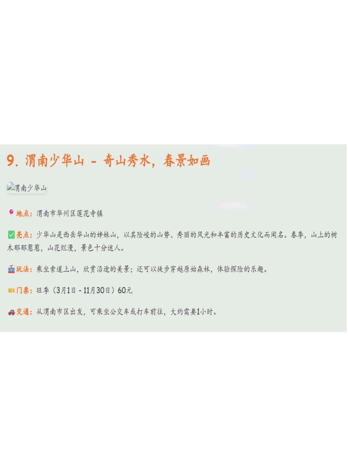 亮点:少华山是西岳华山的姊妹山,以其险峻的山势、秀丽的风光和丰富的历史文化而闻名。春季,山上的树木郁郁葱葱,山花烂漫,景色十分迷人