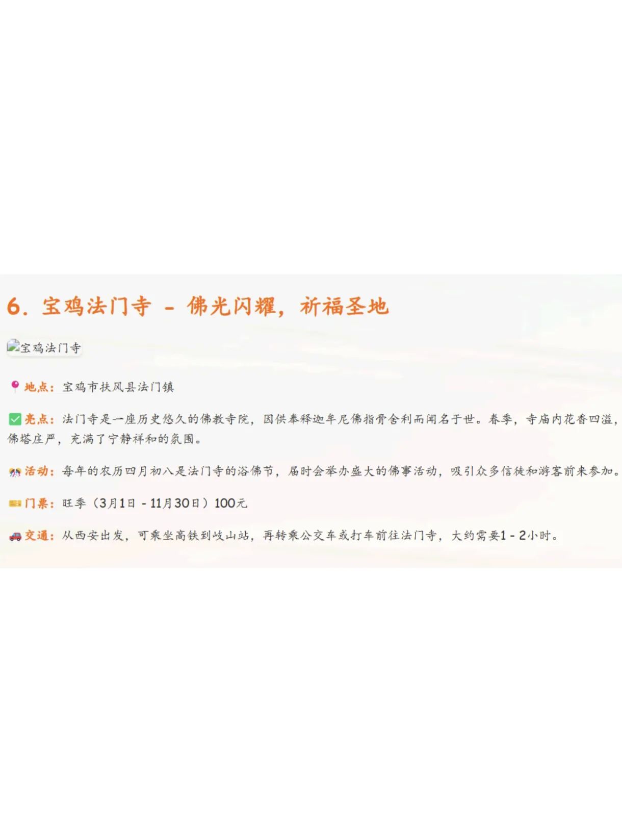 亮点:法门寺是一座历史悠久的佛教寺院,因供奉释迦牟尼佛指骨舍利而闻名于世。春季,寺庙内花香四溢,佛塔庄严,充满了宁静祥和的氛围。