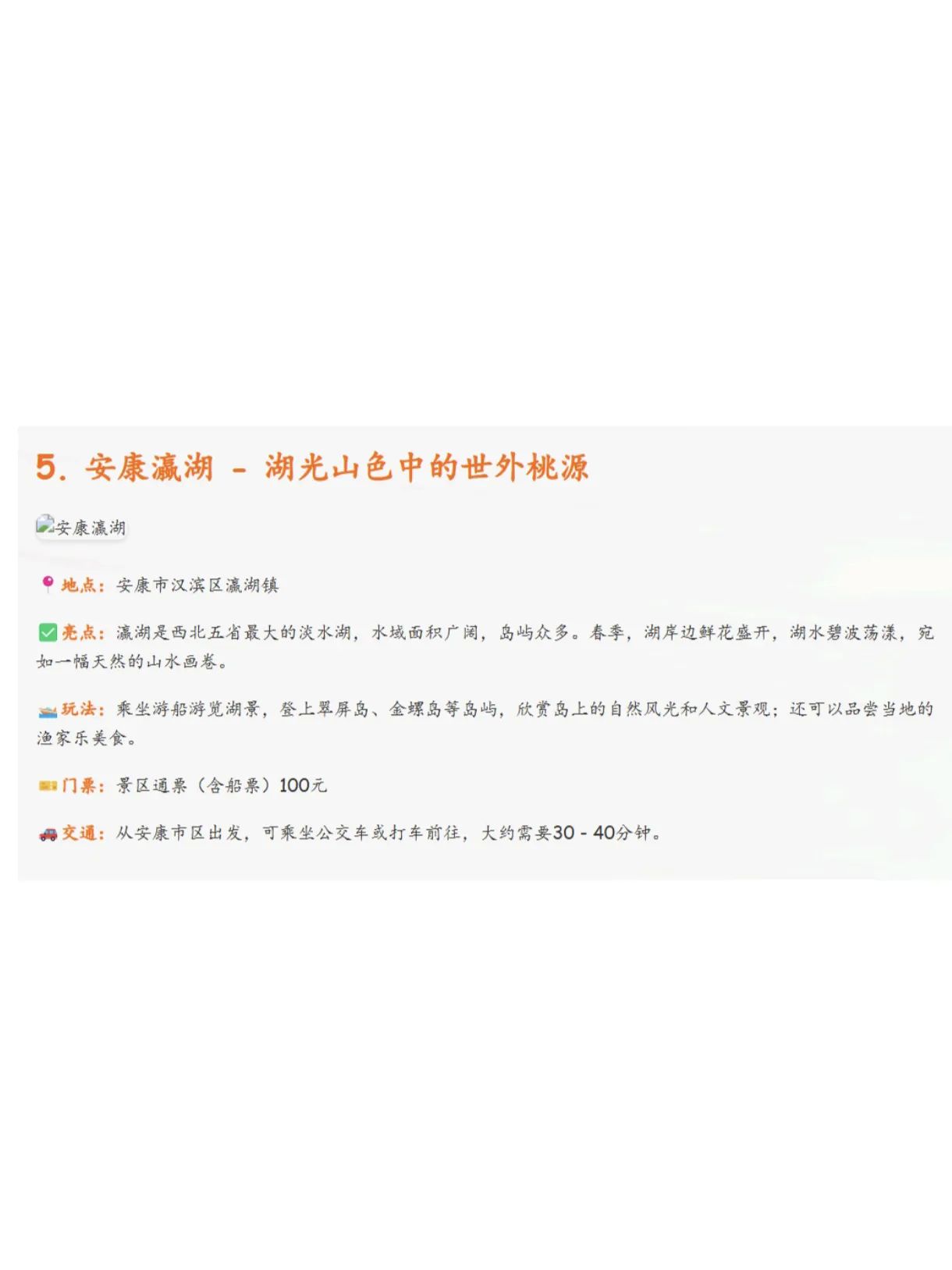 交通:从安康市区出发,可乘坐公交车或打车前往,大约需要30 - 40分钟。