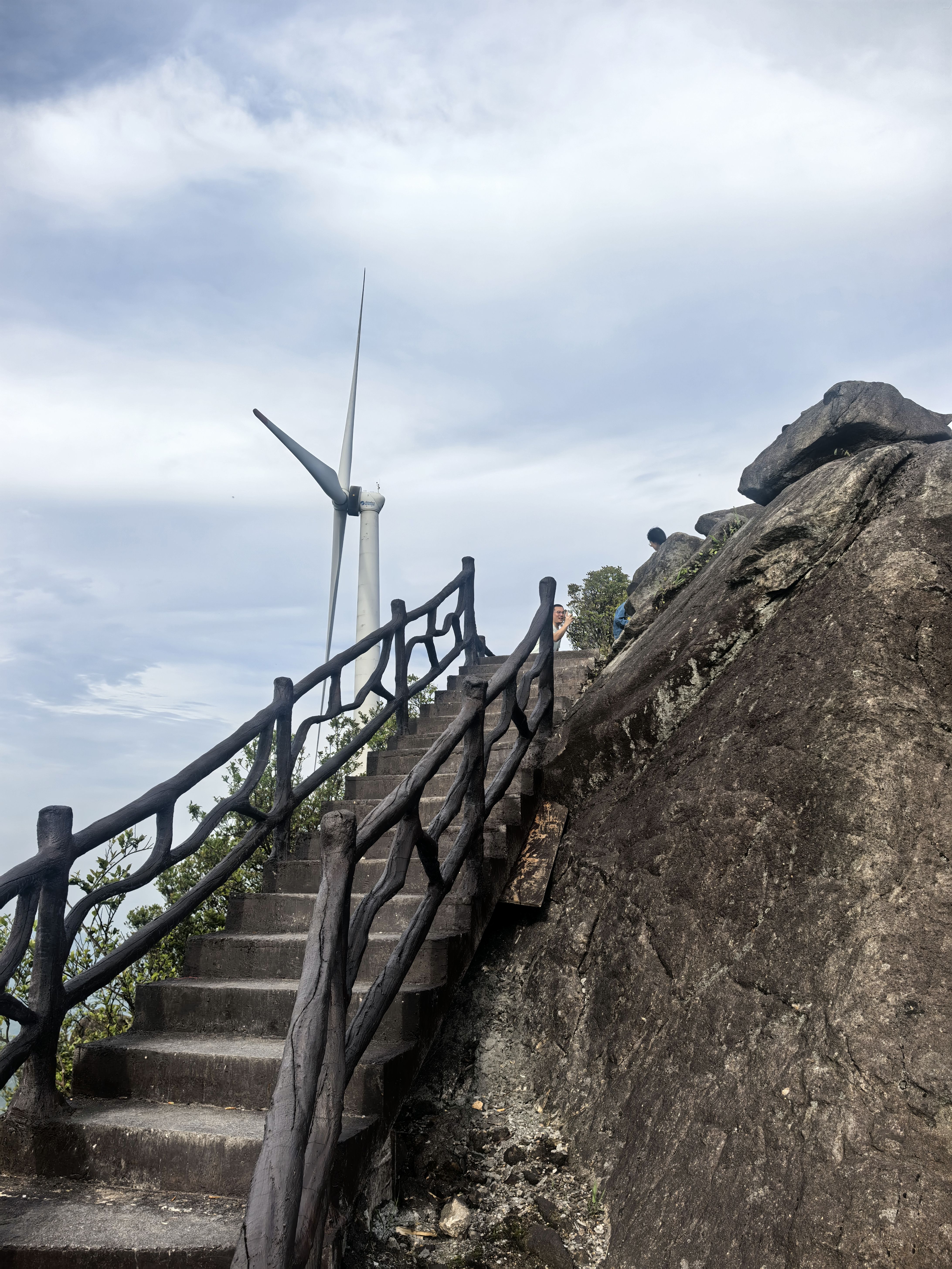 安顿了一下,我们准备向顶峰进发。当地政府修好了上山的道路,全部修筑好防滑的石板路,一步一个台阶,两边都修建好围栏,安全问题不用任何担心。走到一个小坡顶,极目远眺,四处山峦尽收眼底,山风徐来,真是令人心旷神怡。
