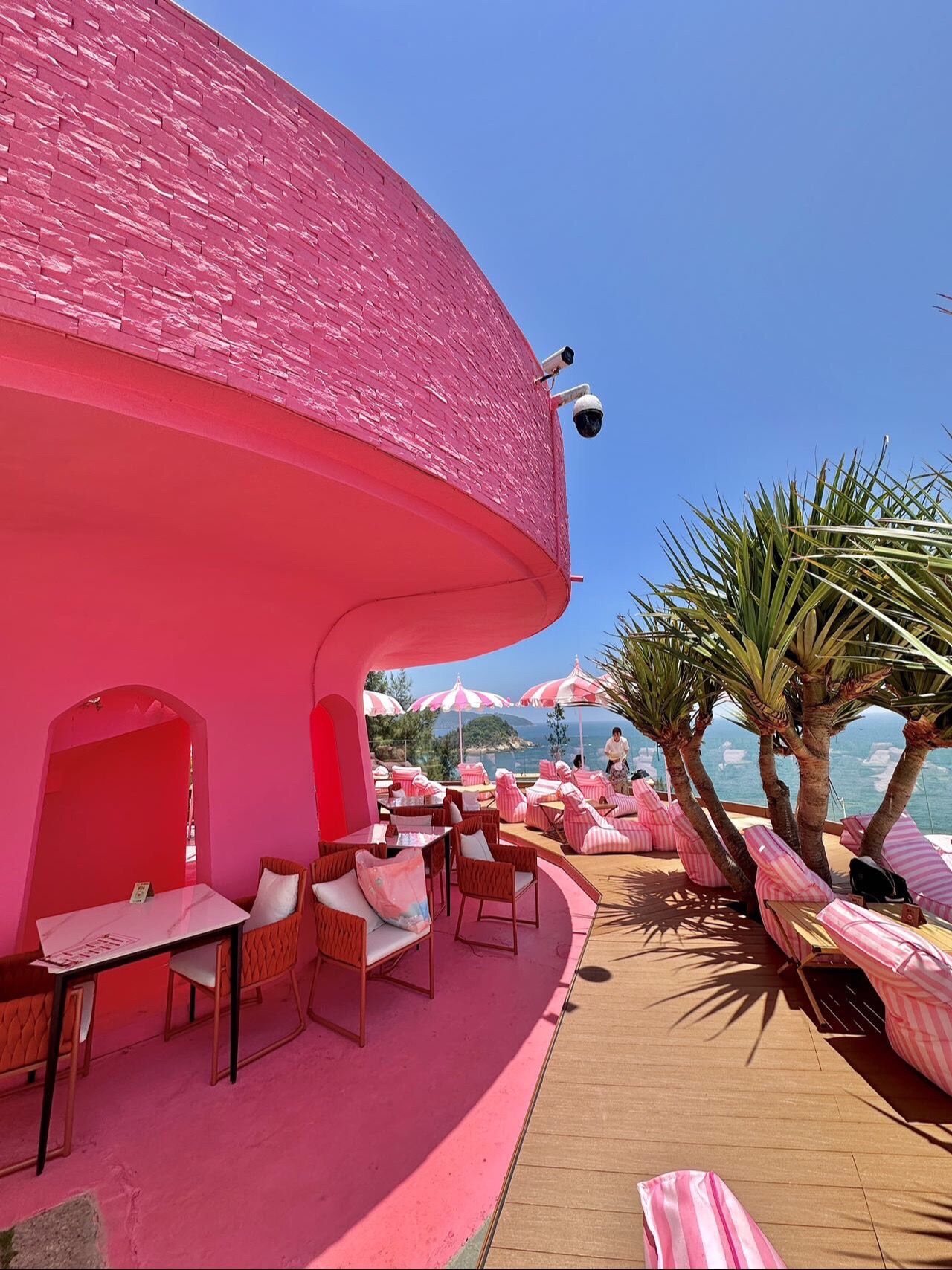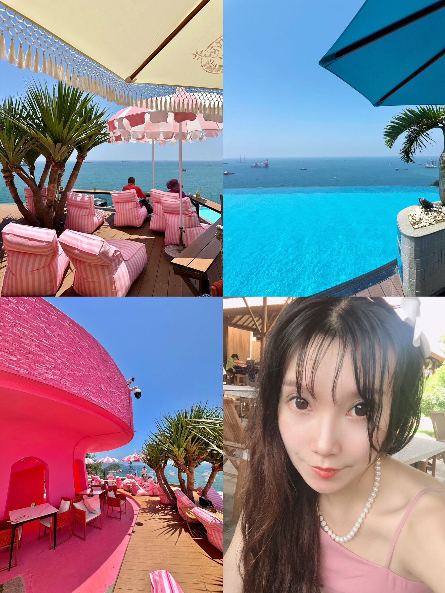山体公园彩虹灯塔海边秋千粉色螺旋梯观景台悬崖无边泳池临海栈道椰林沙滩。