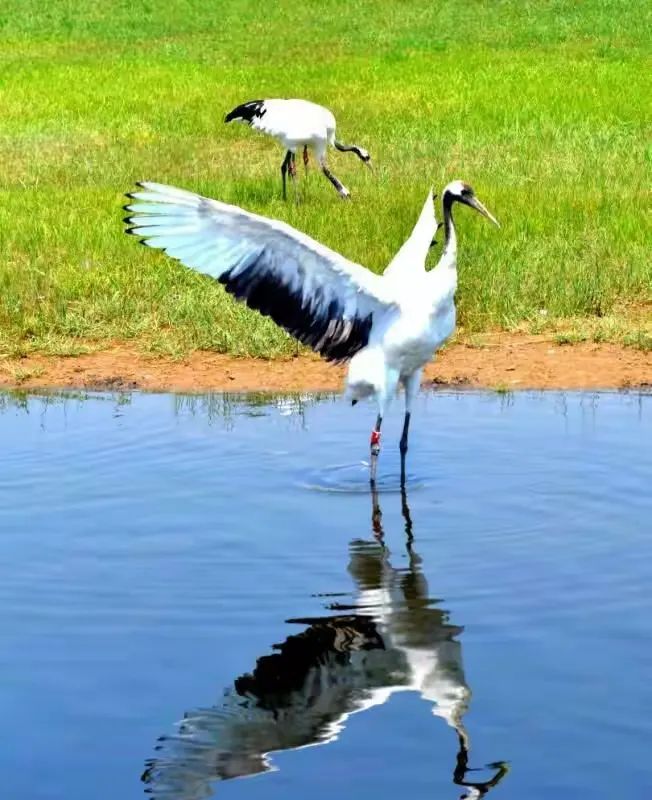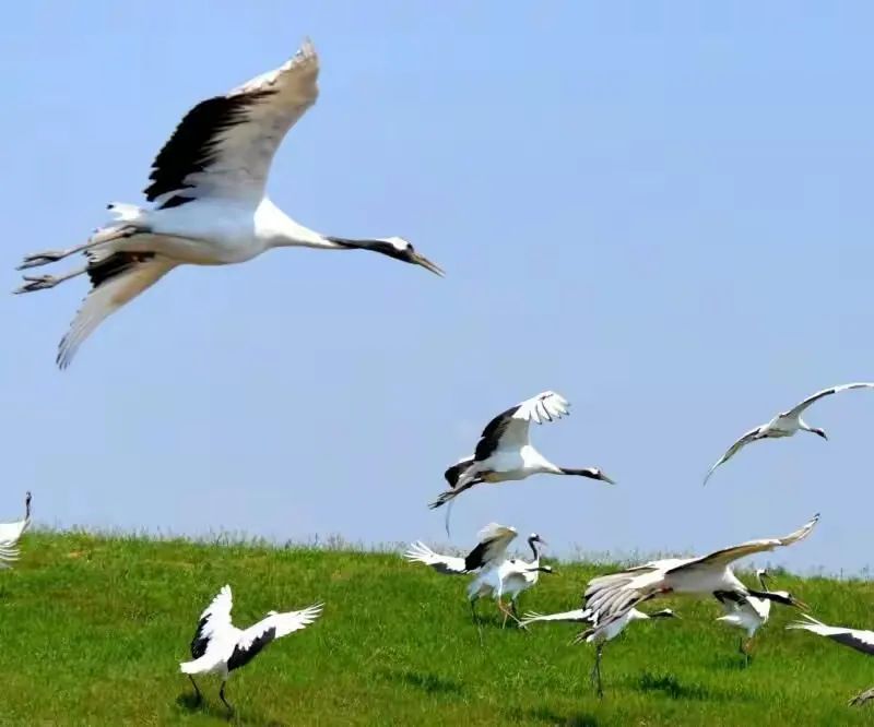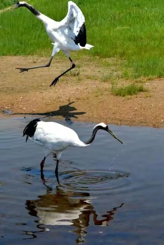 我屏息,怕惊扰了这旷世的彩排:修长的腿探入浅滩,脖颈划出优雅的弧,忽然振翅——白羽掀起雪浪,黑翼描出墨线,红冠则是一枚朱砂印,盖在天地这幅大写意上。最动心魄是鹤舞,双鹤对鸣,素翅陡然舒展,化作丈余白练当空舞动。足尖轻点浅滩绿地,它们时而并立,时而盘旋,腿绷如弓弦,每一次腾跃都似将大地的精气吸入羽翼。当两鹤颈项交缠,朱冠相映,恍若白衣仙人执笔,以缠绵姿态在晨光里,把忠贞与长寿,都编进自己的节拍。此情此景,方知古人以鹤喻君子,实非虚言。