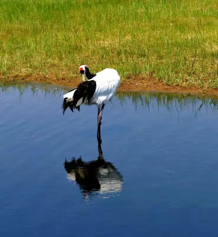 齐齐哈尔扎龙生态保护区,被公认为“世界大湿地、中国鹤家乡”。七月的扎龙,万顷苇海波涛汹涌,绿浪起伏,鹤唳便从浪底浮起,一声、两声,清亮得冲淡了湿地薄雾。当我站在观鹤台上远眺,只见几十只丹顶鹤,在蓝天白云下,从碧绿色的 小山坡后面,或缓缓地漫步走近,或低空飞行而来,使我们近距离的接触到丹顶鹤的英姿。那么醒目,那么清新,又是那么别致。它们在空中盘旋后,便轻盈的落在了山坡上、河滩边、绿水中。它们走路是那么的轻盈,姿态是那么的悠美。仿若大家闺秀,十分雍容,十分华贵。有的引颈高歌;有的静静的看着游客;有的安祥的听着人们对它的点评;有的在闲庭信步;有的翩翩起舞;有的情侣相互玩耍,相互戏颈,相互梳理着羽毛。远远望去,数点丹顶如跳动的火苗,在苍茫里写下最生动的诗词。鲜红的顶冠如朱砂滴落素绢,在苍茫水泊间燃起一缕耀眼的火种。鹤的步履最堪玩味。纤足探入浅沼,轻巧如诗人掂量字句。淤泥漫过趾爪,提起时却皎然不染,仿佛这片黑土甘愿以自身滋养这份皎洁。