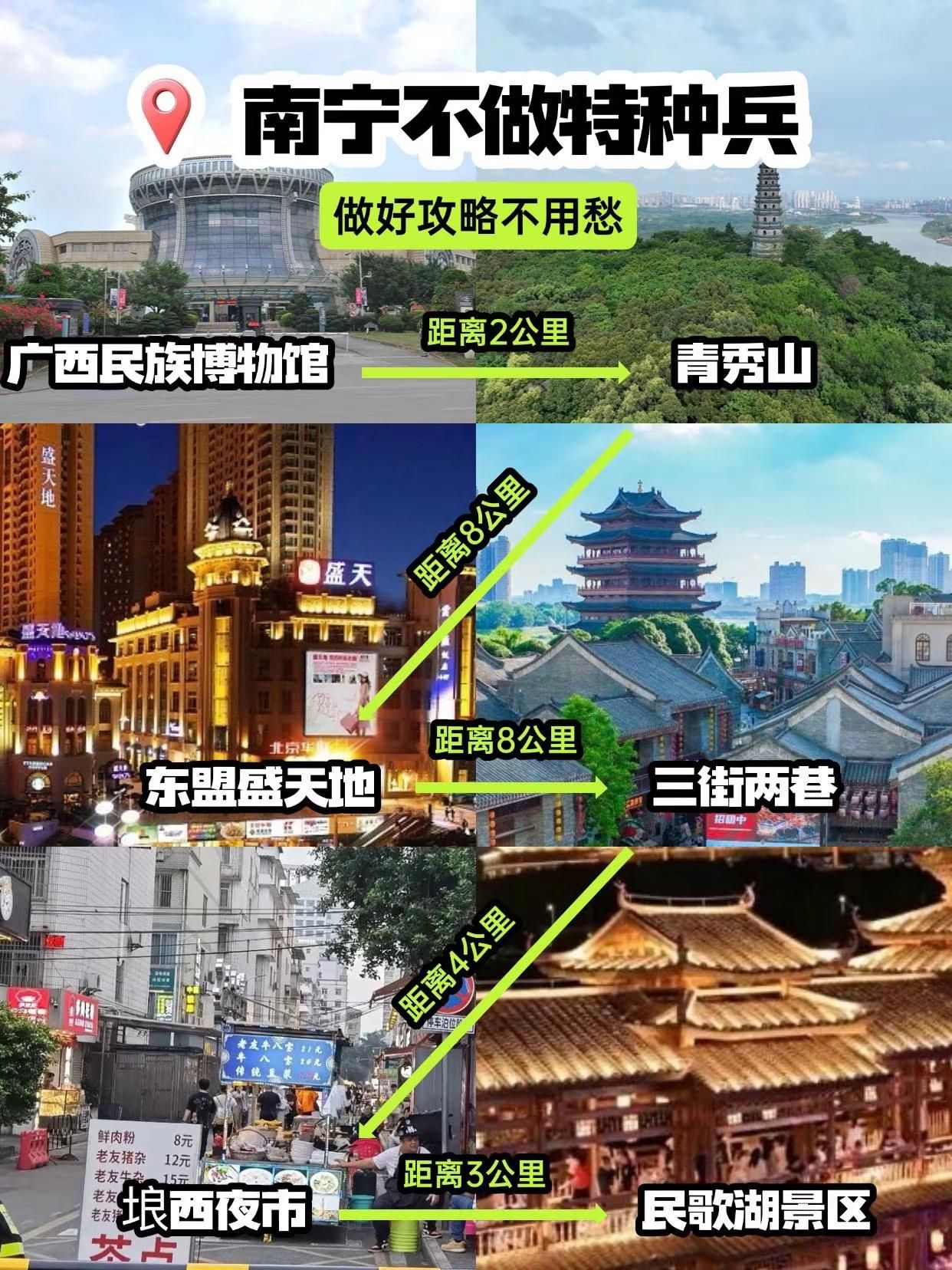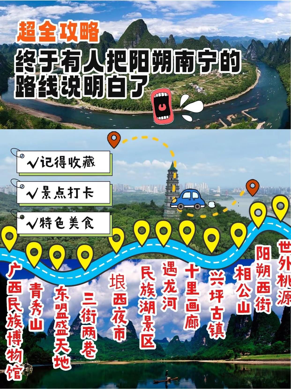 2天玩转阳朔南宁,景点美食全方位指南2天游玩阳朔南宁,做好攻略真的不用慌!山水、古镇、夜市、地标全打卡,附超顺路线+必吃清单,新手直接抄作业!路线指南阳朔篇:沉浸式躺平赏山水1. 遇龙河十里画廊(14.1km)遇龙河坐竹筏,小电驴逛十里画廊,超治愈~2. 兴坪古镇相公山(27km5km)早起去相公山,登顶就能看到漓江第一湾的日出兴坪古镇别只冲20元人民币背景地3. 相公山阳朔西街世外桃源(28km15km)西街吃桂林米粉,逛会儿文艺小店再出发去世外桃源。~南宁篇:逛吃暴走感受烟火气1. 广西民族博物馆青秀山(2km)上午去民族博物馆,看56个民族的服饰和手工艺品,拍照很出片!下午直奔青秀山,空气超清新~2. 青秀山东盟盛天地三街两巷(8km5km)从青秀山出来去东盟盛天地,逛潮牌店、喝杯咖啡歇脚,傍晚去三街两巷。老骑楼里藏着很多南宁老字号,买袋酸嘢边走边吃,感受百年街区的慢时光~3. 三街两巷埌西夜市民歌湖广西文化艺术中心(4km3km6km)逛吃灵魂必须交给埌西夜市!老友粉、烤生蚝、卷筒粉闭眼点,再买杯槐花粉解腻~吃完去民歌湖坐游船,看岸边灯光倒映在水里,最后去文化艺术中心看场演出,完美收尾!美食指南三个椰子(三街两巷店)谢大姐非遗啤酒鱼(印象店-黑金店)岩洞餐厅发呆·半山空中九号生态苑农庄(十里画廊遇龙河店)稻花开了·茶汤鸡小贴士• 阳朔到南宁建议坐高铁,1.5小时直达,省时又方便~• 阳朔竹筏提前在网上订票,避开旺季排队;南宁夜市晚上7点后更热闹,记得空着肚子去!亲测2天这样玩不赶不累,还能把两地精华都打卡!#阳朔美食#南宁美食#广西旅游攻略#广西周边游#国庆出行