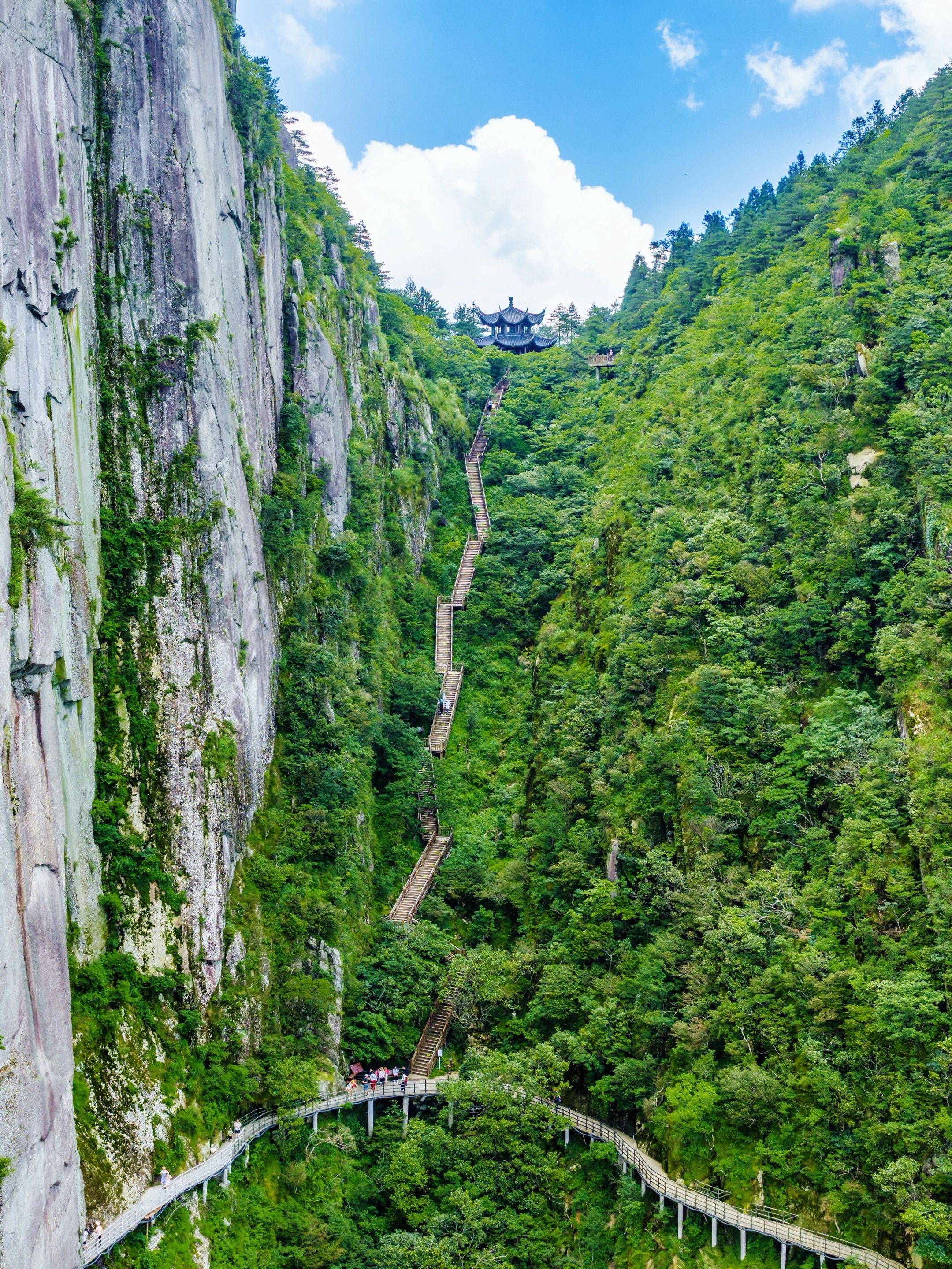 吉安羊狮慕景区以奇特的花岗岩峰林地貌、丰富的自然景观(云海、佛光、飞瀑等)、深厚的福文化与道教底蕴为代表,很适合假期游玩。凌云栈道是必玩的,它全长4000余米,蜿蜒盘旋在深不见底的悬崖峭壁之上,宛如一条巨龙随着山势起伏,游客可以在此全方位欣赏到景区内的奇峰怪石、云海雾涛等绝美景观。
