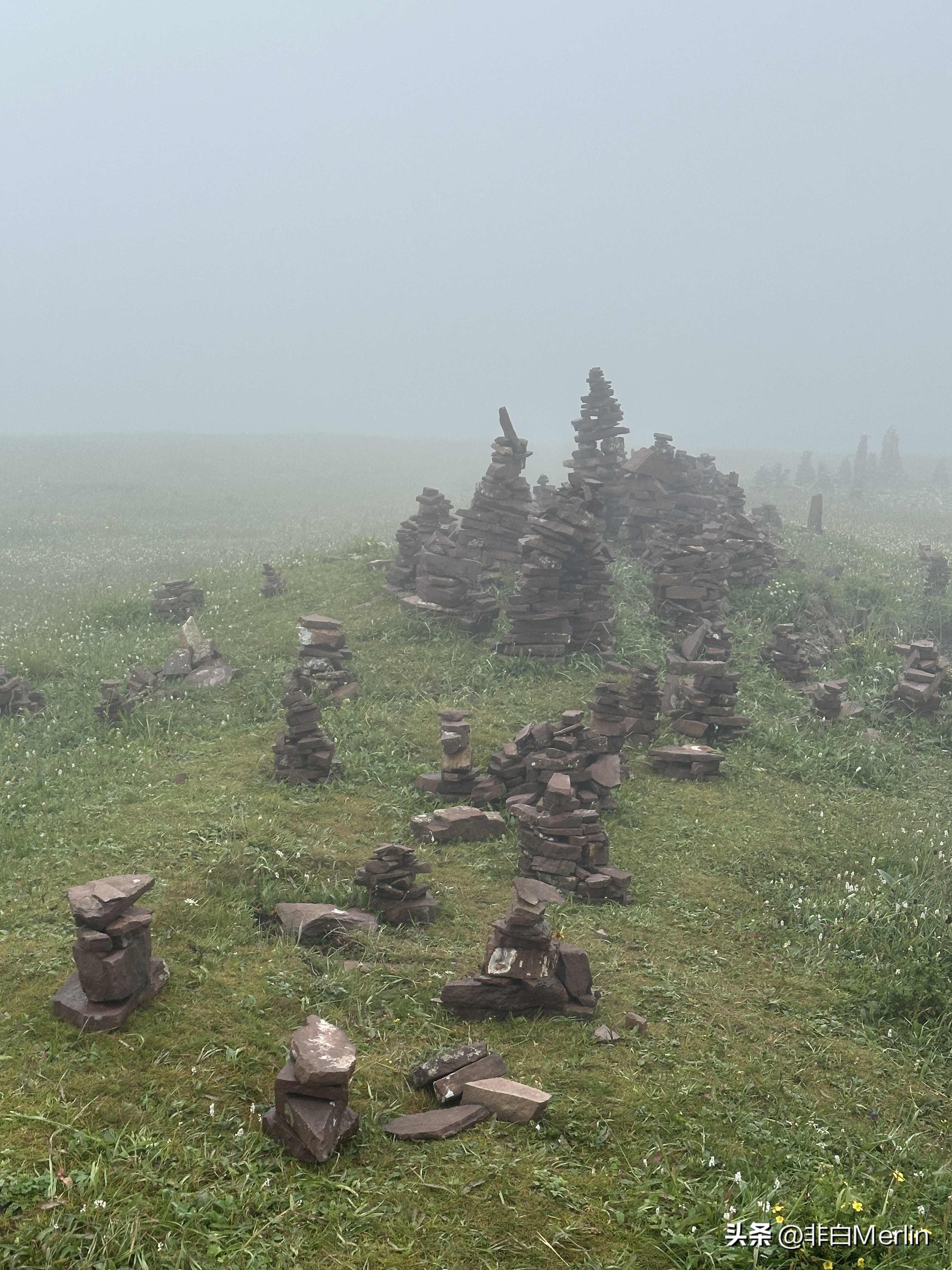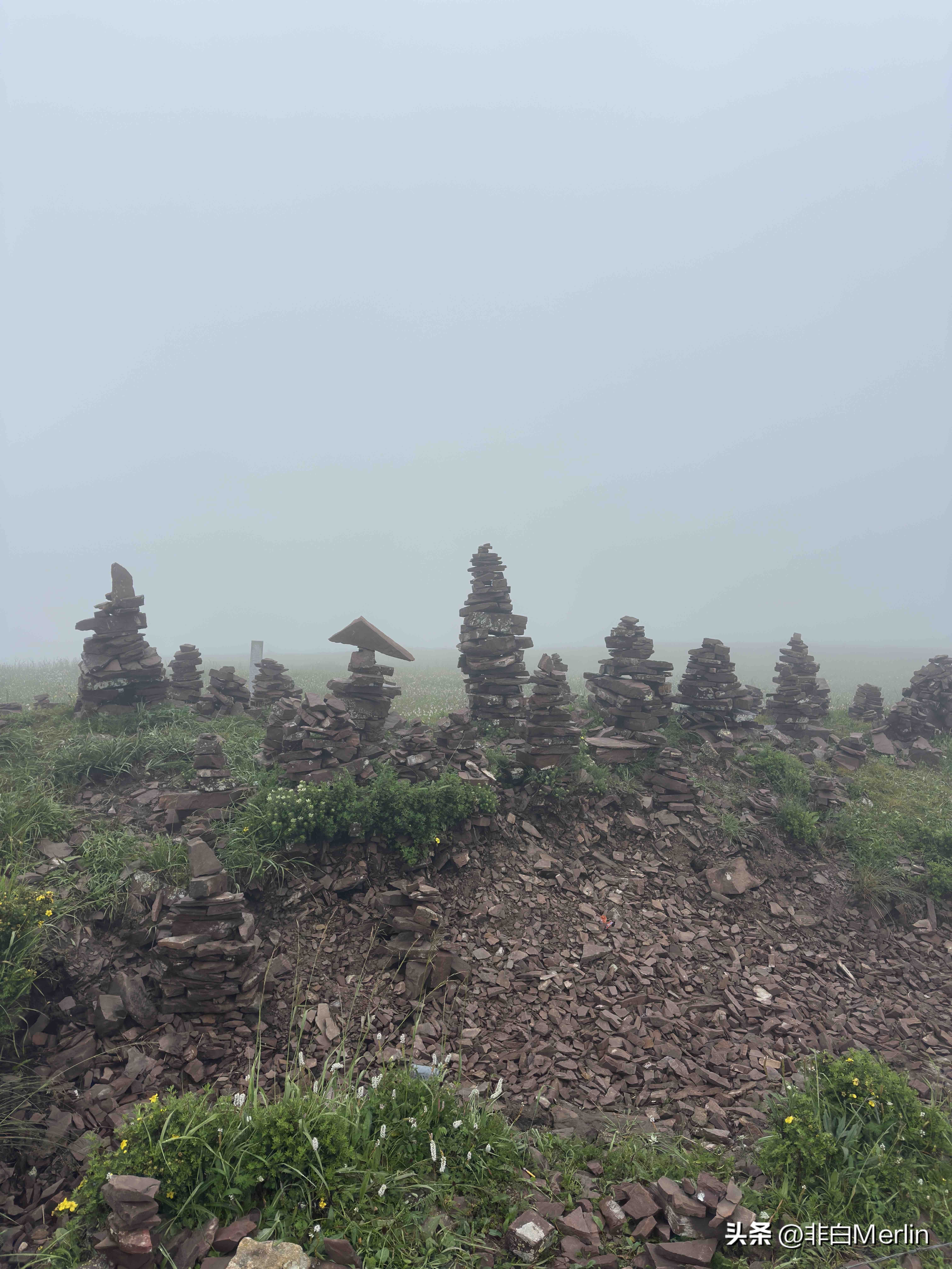 抬头望去,往日开阔的草甸被浓雾揉成了一幅写意画。近处的野花半隐在雾里,远处的山脊线完全没了踪影,原本清晰的“骆驼石峰”只剩个模糊的轮廓,像水墨画里未干的淡墨,风一吹,那轮廓便轻轻晃了晃,似要融进更深的雾色里。