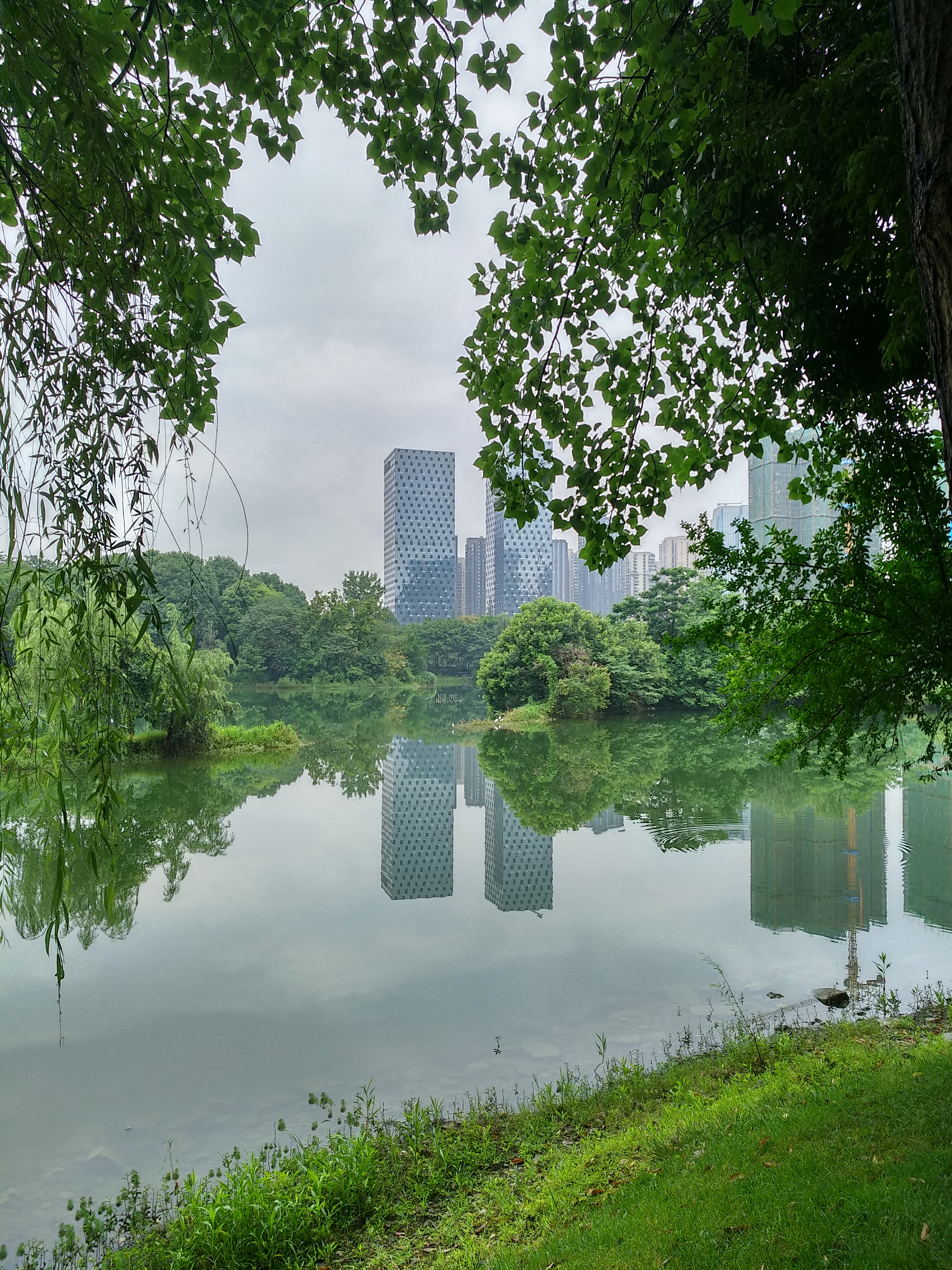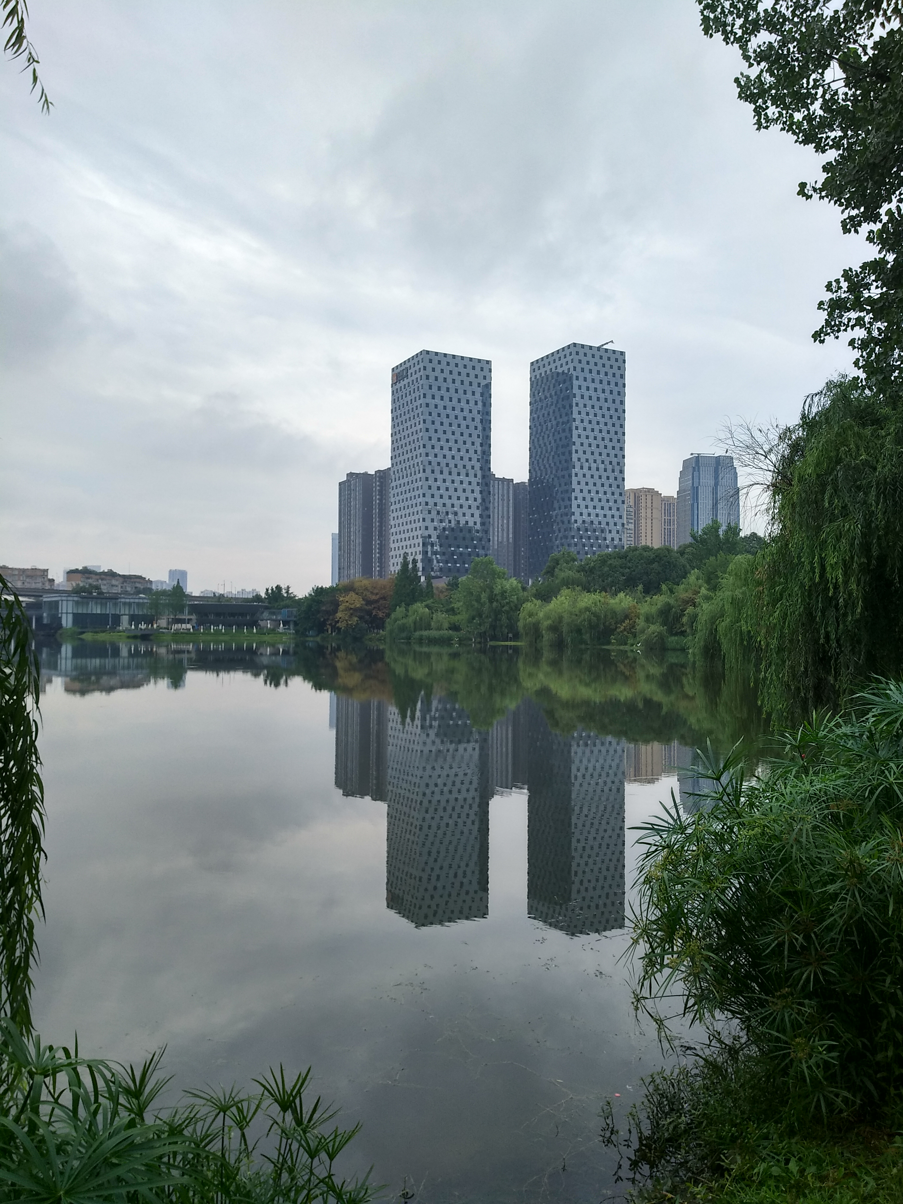 双子大楼在湖面倒影的衬托之下颇有几分魔幻色彩。