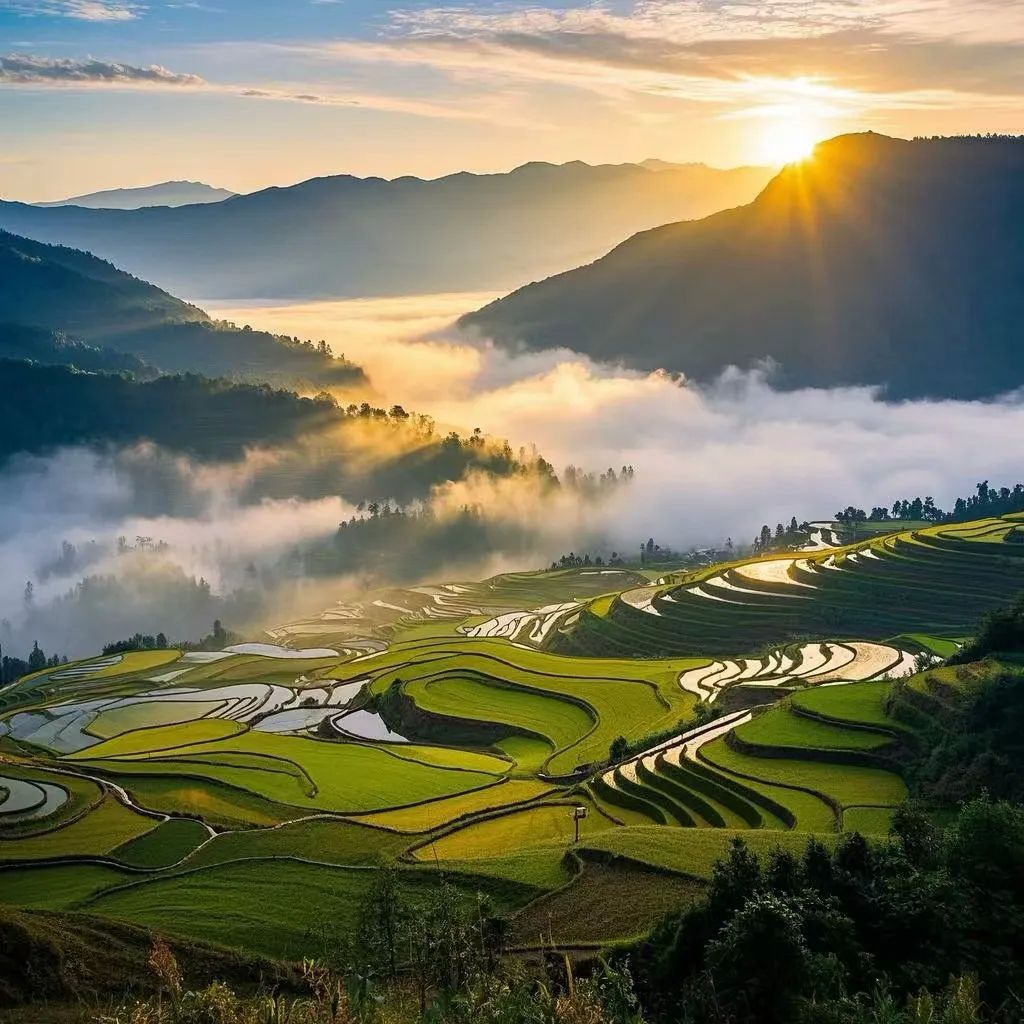 三月,元阳哈尼梯田迎来了一年中最美的时刻——灌水期。此时,层层水田如同一面面明镜,镶嵌在山间。日出时分,云雾缭绕,金色的霞光洒在水面上,倒映出五彩斑斓的色彩,如梦如幻,仿佛是大自然精心绘制的光影幻境。