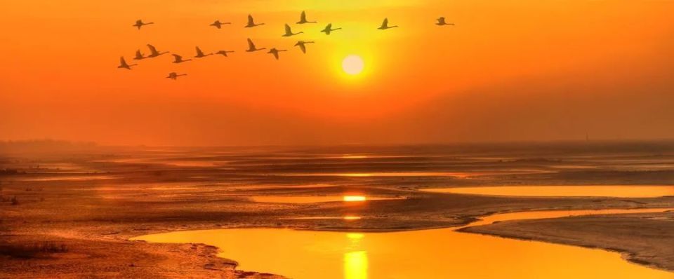 群鸟飞起,好似黄河水中飘出的音符盘旋于空中,伴随着幽幽长啼飞穿秋日艳阳。