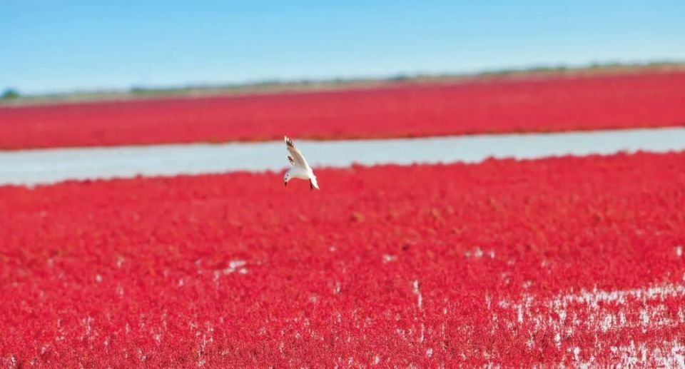也许平时,在黄河口的滩涂上看到的景色是青绿色的水流搭配鹅黄的植被、蜿蜒的沟壑,但是从9月份开始,滩涂慢慢变红,红毯蔓延开来,秋日的滩涂,身着一身红袍。