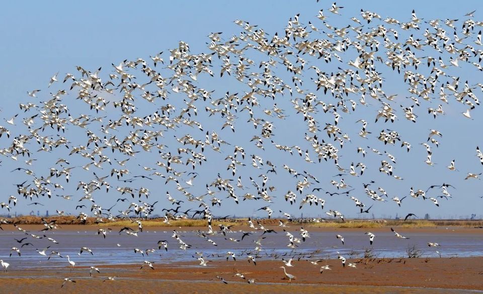 黄河带来的大量泥沙,让这里拥有了世界上最完整的湿地生态系统,每年数百万只鸟类组成“飞行编队”在这里穿梭,让这里成为了名副其实的“鸟类国际机场”。