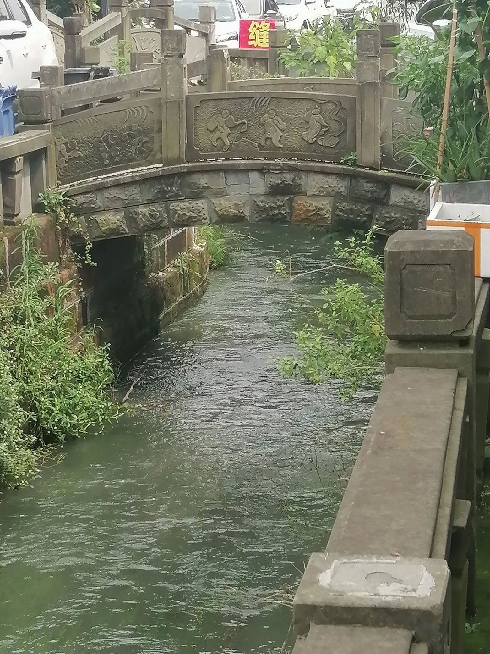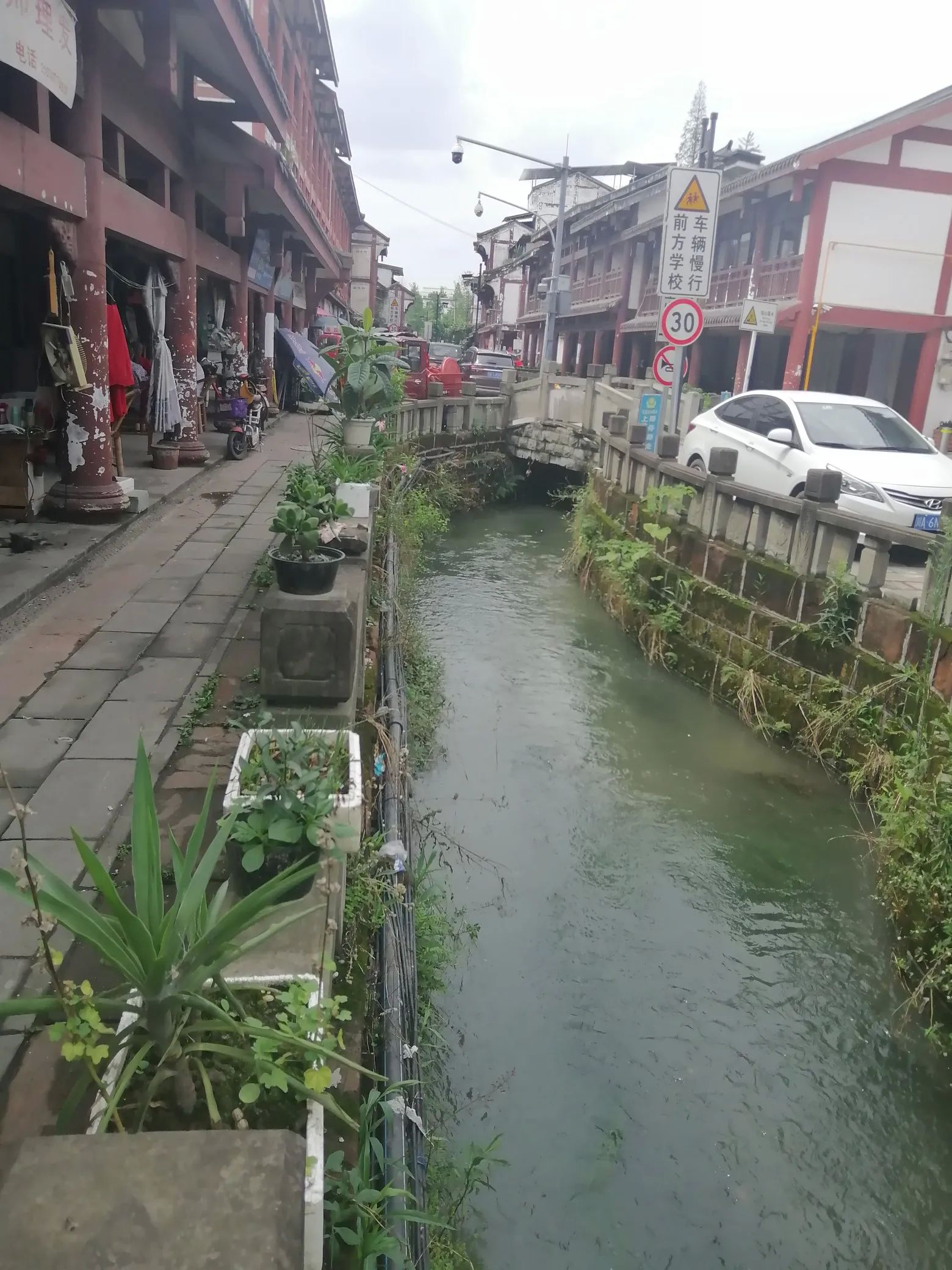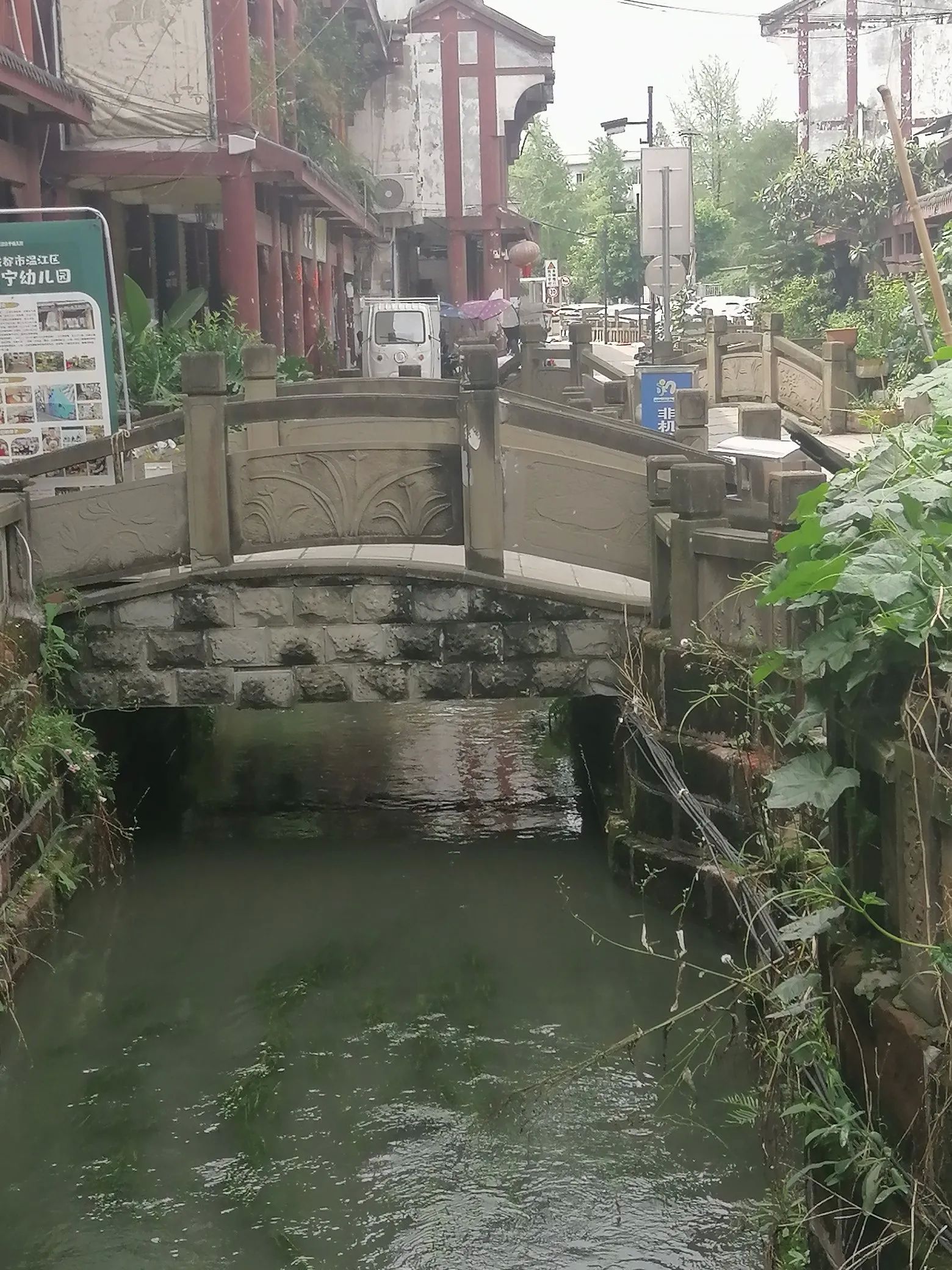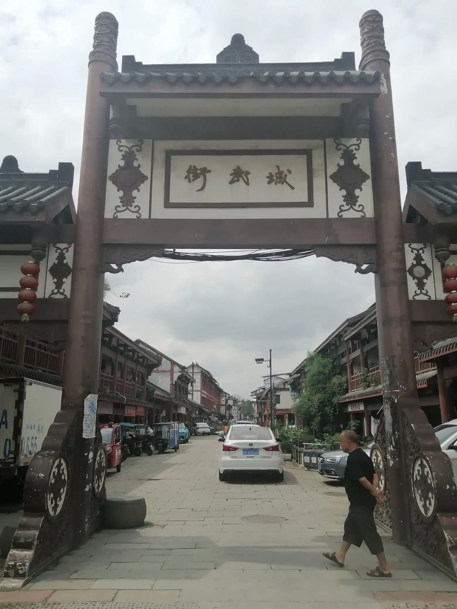 镇虽不大,但横竖有好几条街,大都是解放后修的房子。但我准备到文化广场的途中,经过一座古老的牌坊,上有《城武街》三个字。我经过牌坊往里走,一条小溪哗哗的流尚,两边砌有石头栏杆,小桥溪水的两边,有古老的清代建茿。全是木板装的墙壁,柱头,门槛,均留着古老的痕迹。