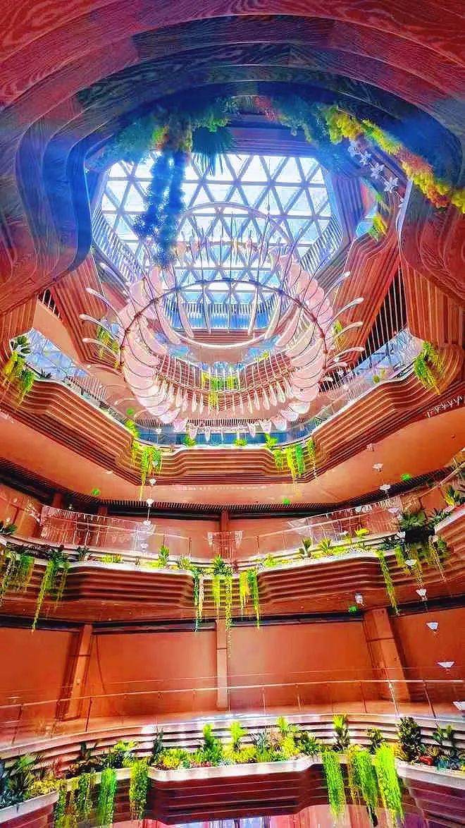 环形绿植电梯:被绿植覆盖的环形电梯极具视觉冲击力,无论是从一楼仰拍,还是乘坐时观赏交错的楼层电梯,都能拍出超有创意的照片。
