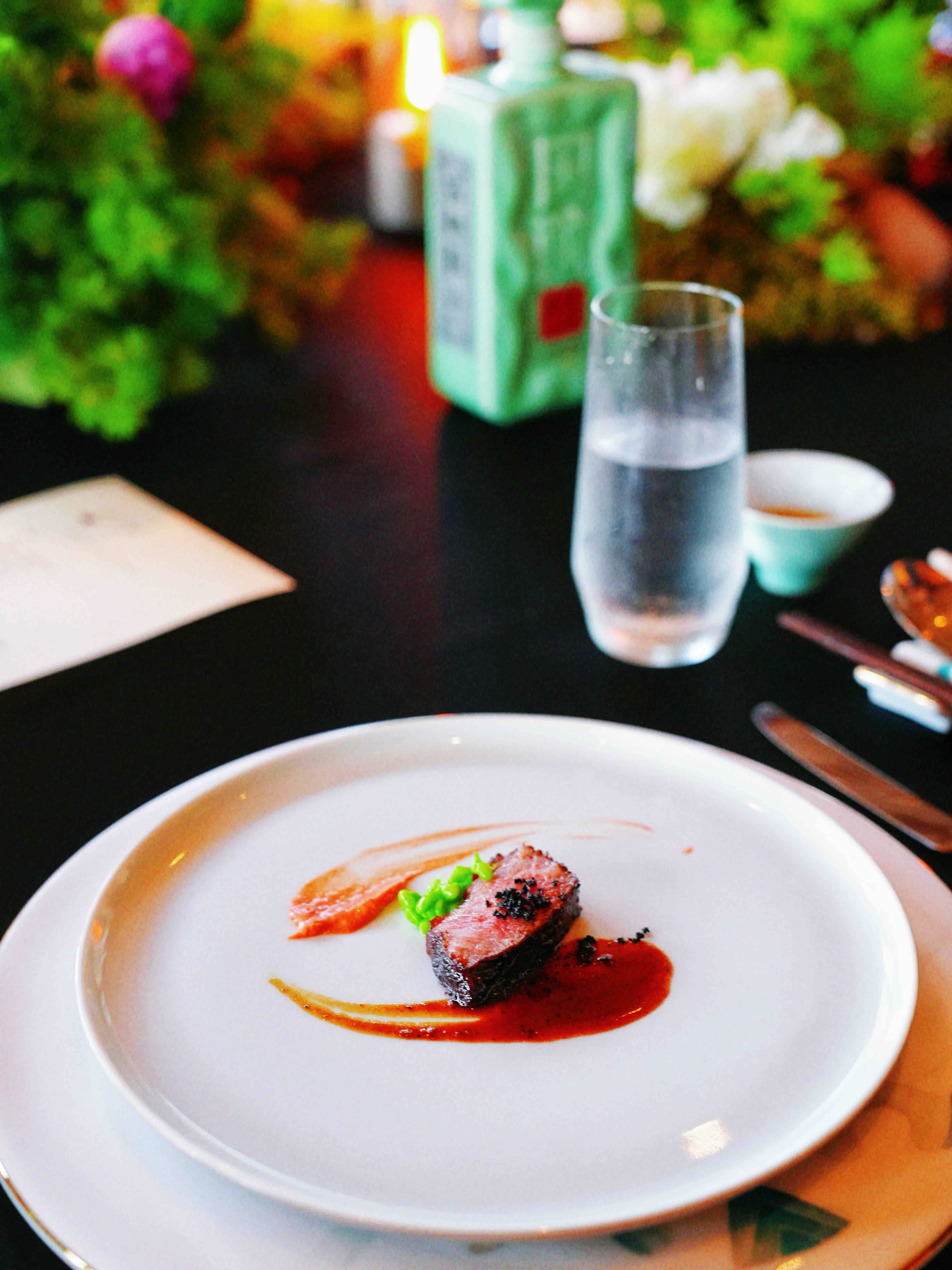 压轴的绍兴干菜雪花牛*更是惊艳!乌黑油亮的传统干菜碎,如墨渍般晕染在顶级雪花牛肉的肌理间,高温炙烤下,干菜的醇厚咸香与牛肉丰沛的油脂、细腻的肌理完美交融,入口即化,咸香回甘。