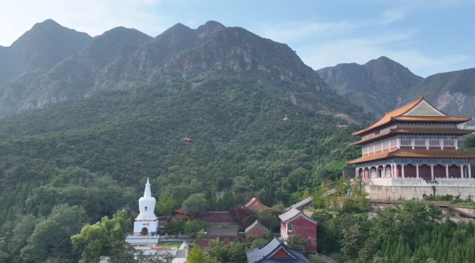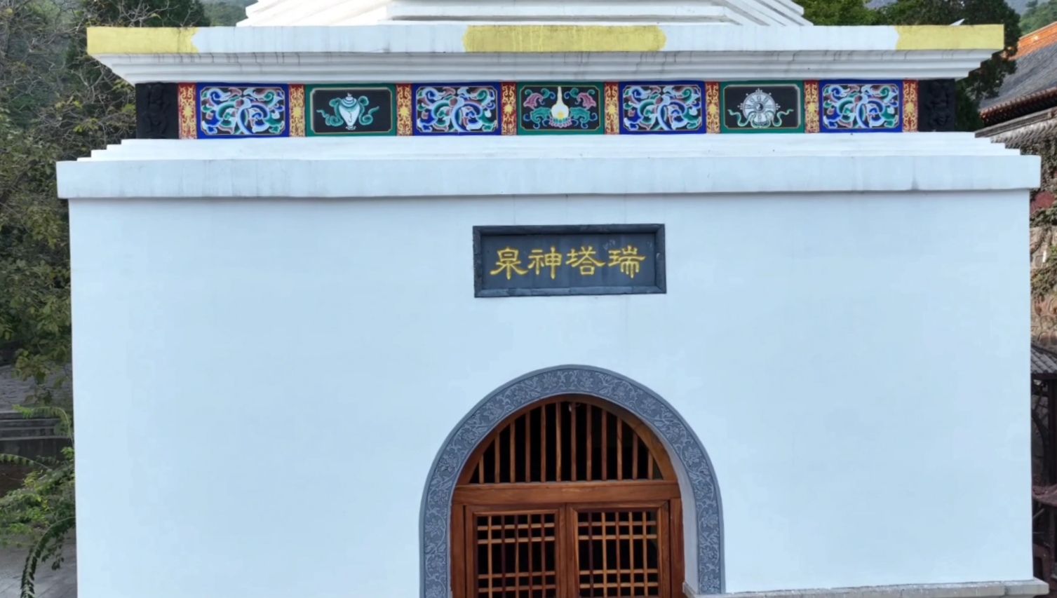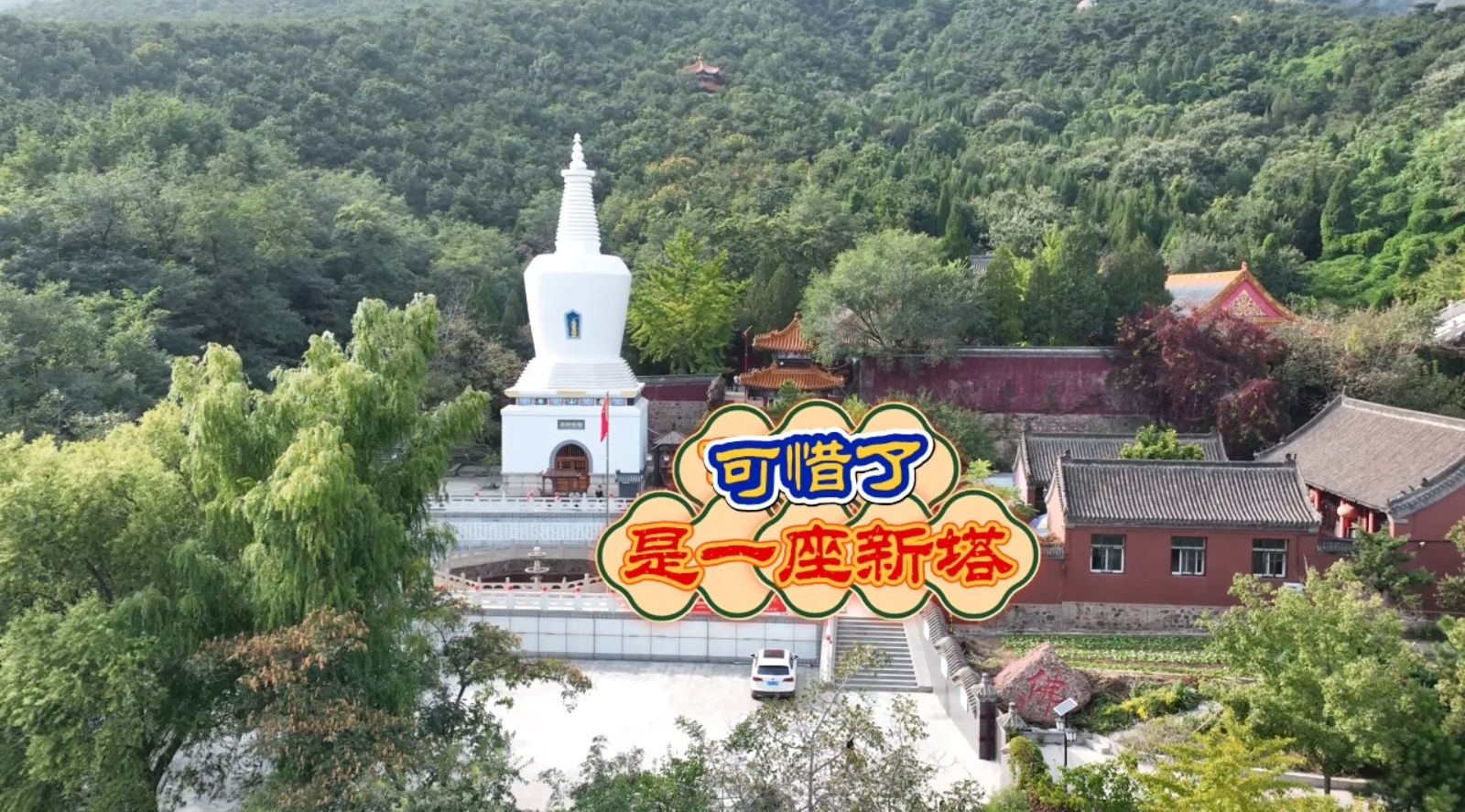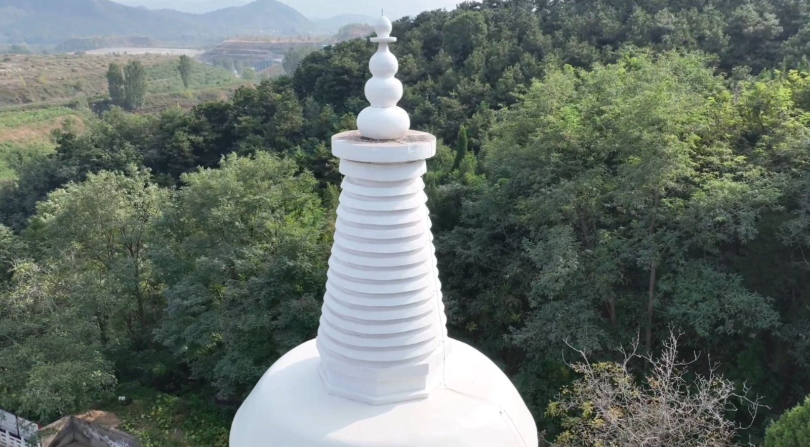 空中俯瞰,灵山寺白塔还有几分特质。宝塔为覆钵式,通体用砖石砌筑,共分塔基塔身和塔刹,高约二十八米。塔基用大理石砌成一个浅束腰的须弥座,塔基用砖砌成一个高约九米边长约六米的四方体基座,塔内有塔心室,室内中间有一眼泉水,这就是灵山寺的圣泉,里面四壁还有女娲补天的彩画。