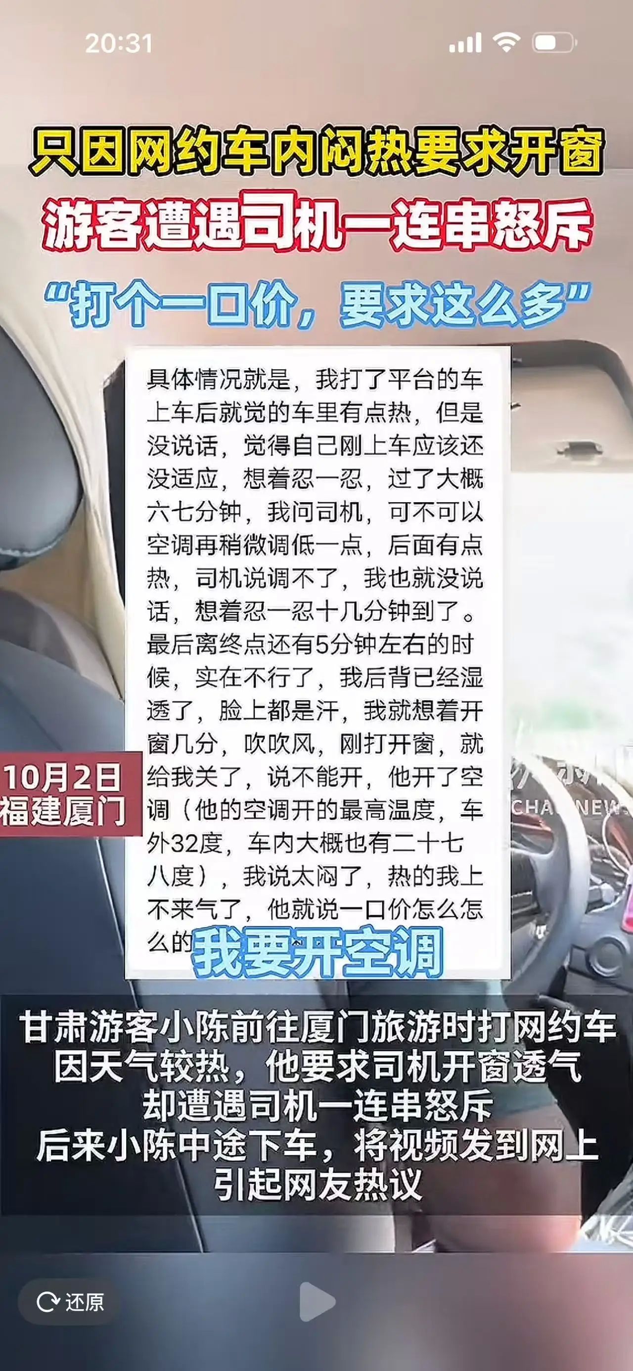 在这个炎热的夏天,出门旅游本该是放松心情、享受风光的美好时光,可偏偏一段“打车事件”把原本的愉快变成了网络上的热议话题。甘肃的游客在厦门旅游期间,为了避暑透气,提出开窗的请求,却遭遇司机的怒斥:“打个一口价,要求还这么多!”这一幕瞬间被游客用手机记录下来,上传到网络后,立刻引发了网友们的激烈讨论。