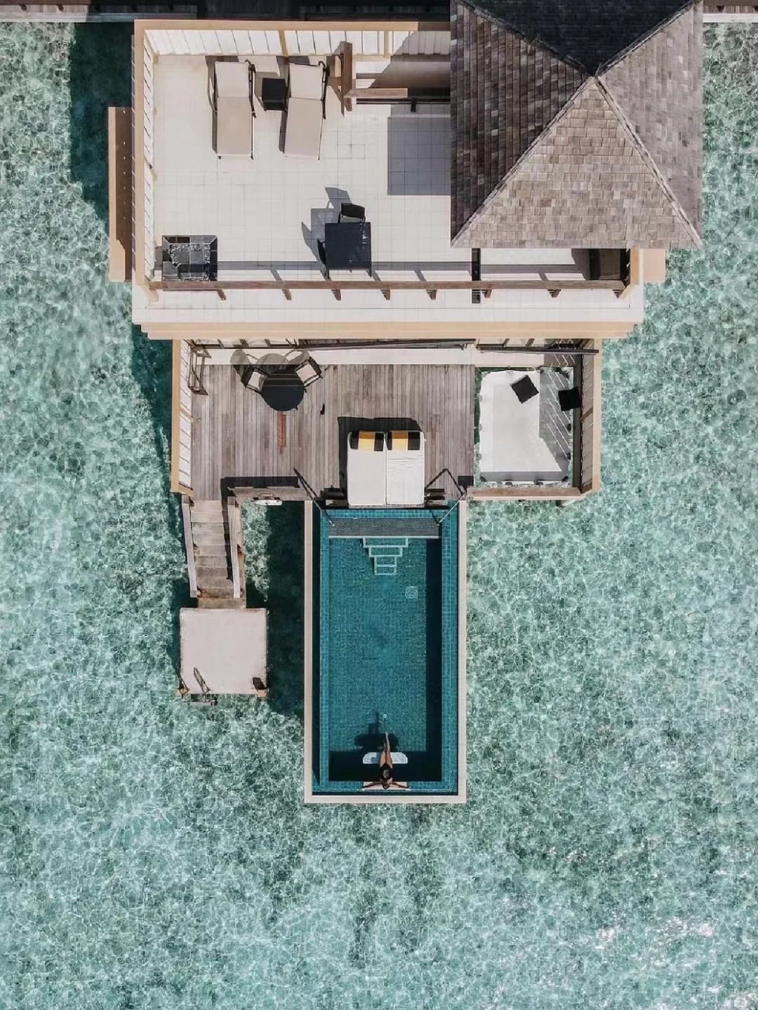 悦榕庄的海中阁,作为马尔代夫独有的双层水屋,屹立于波光粼粼的海面上,与珊瑚礁咫尺之遥,能让近距离欣赏到迷人的果冻海景