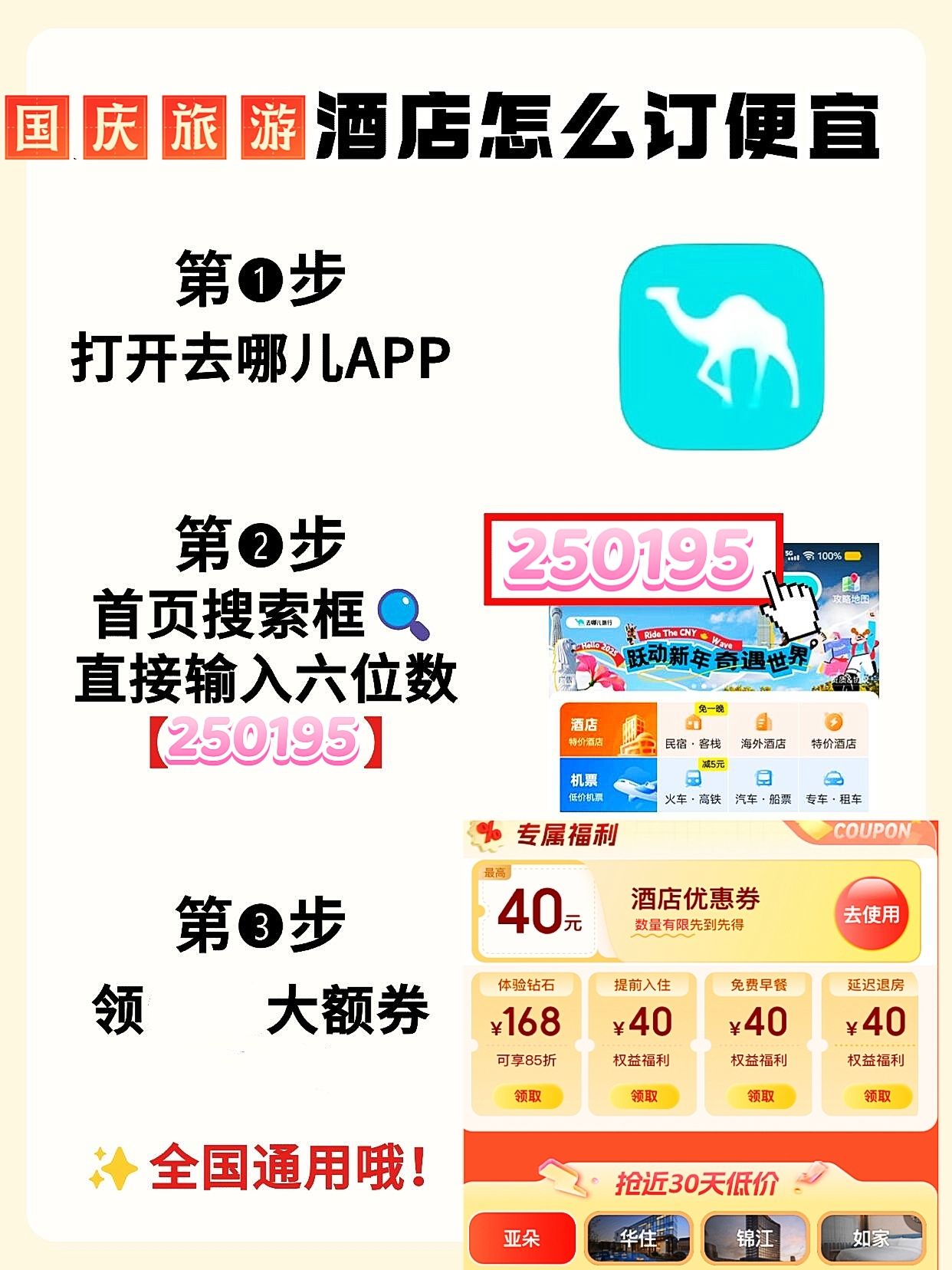 第一步: 在【去哪儿旅行】APP,搜索口令【250195】,领取酒店优惠券!