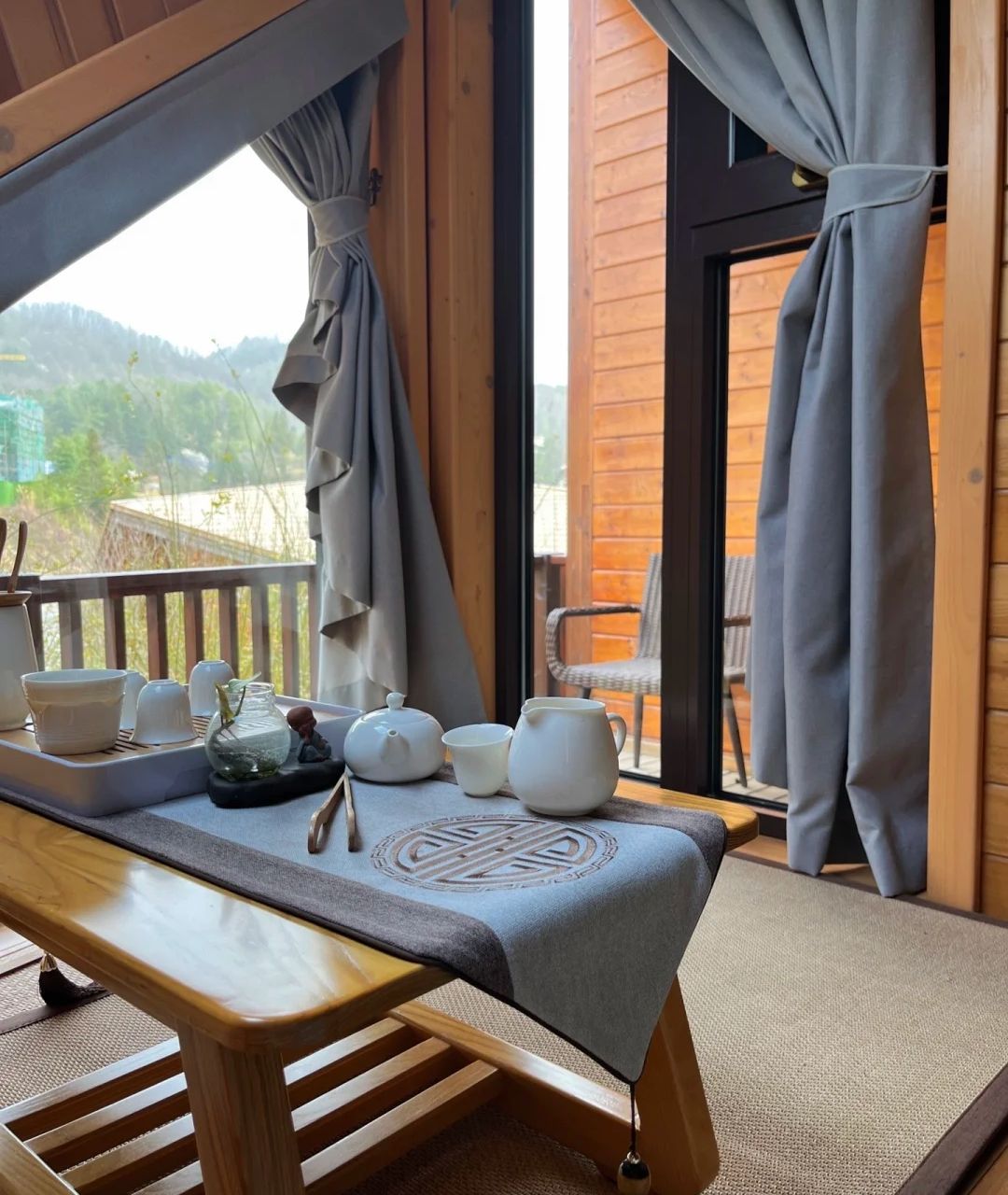 下榻的客房,有湖景与山景之分。我偏爱这全木的结构,四壁、顶棚皆是温润的原木,让人恍若栖息于一棵巨树温暖的腹内。陈设是简约的,但深眠的床垫、精致的卫浴,又在细节处透露着对身心的体贴。尤其是那临窗的浴缸,备好了一次性泡澡袋,可容你浸在温热的水中,看窗外湖光山色,将疲惫尽数交付。小小的露台上,设着榻榻米茶台,捧一杯清茗,便可将“秋水共长天一色”的景致,当作一味最好的茶点,细细品咂。这里的客房,各有其名,“秋水”、“巴山”、“秋池”、“和谷”……仿佛每一间,都收纳了一段山水的精魂。夜宿于此,耳畔是微风吹过林梢的簌簌声与偶尔的鸟鸣,抬眼望去,是无垠的星空。四时之美,就在这静谧中被一一收纳,化作了心间的悠然。