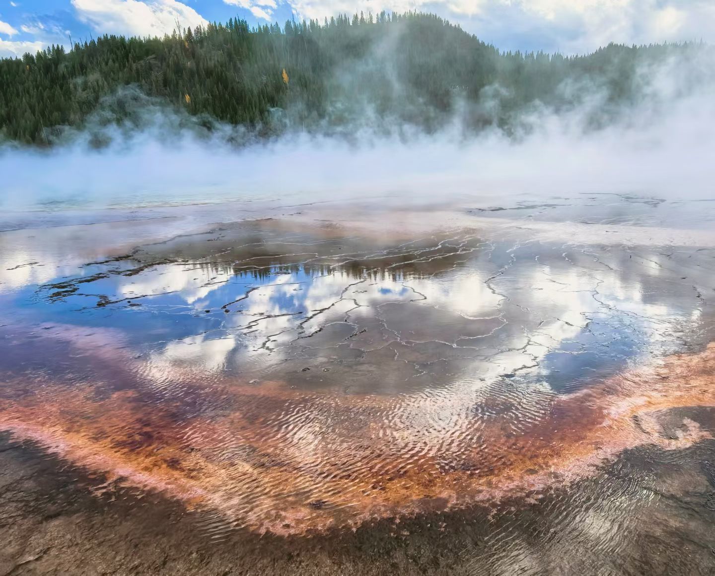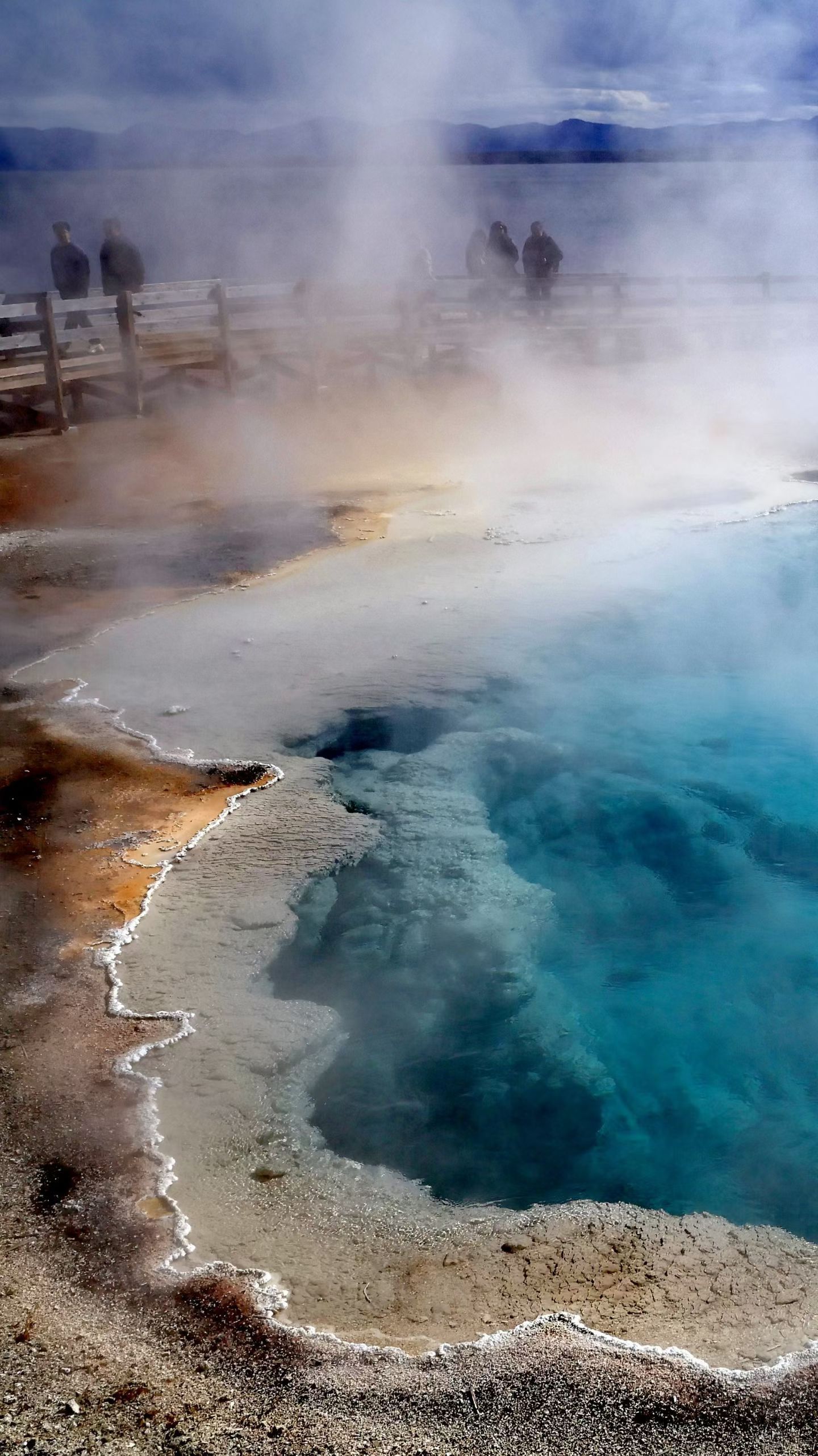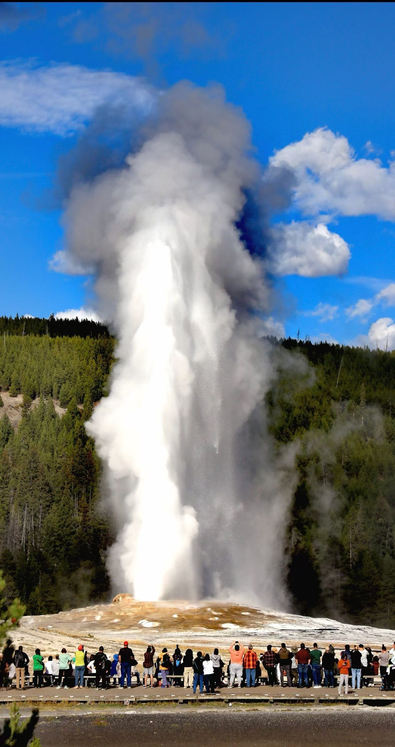 二是处处雾气蒸腾,黄石公园是全世界最大的活火山口,整个公园地下就是涌动翻腾的岩浆,据说这里汇聚着世界一多半的间歇泉和热泉,大大小小有名无名的温泉万余多个。其中老忠泉是最大的看点,因为它极有规律地不到2小时就会忠实地喷发一次,每次一两分钟,喷出的热气最高达百来米。不过,我们在打卡老忠泉的路上,幸运地邂逅了小忠泉(图2)的喷发,它不像老忠泉那么规律,所以更为难得,虽然规模稍小,喷发时间却比老忠泉长得多。