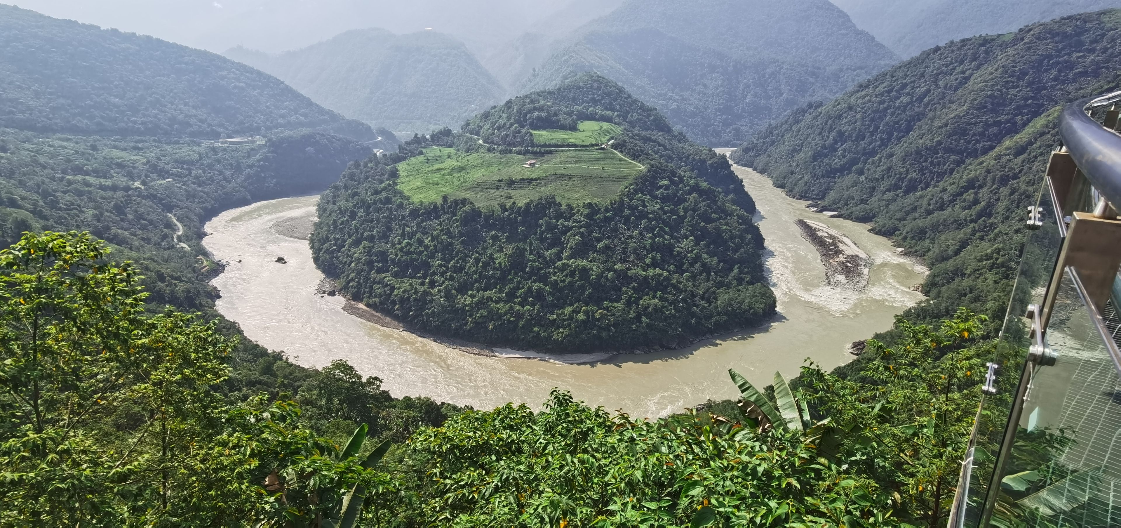 4.果果塘大拐弯:位于墨脱县德兴乡,是雅鲁藏布江的标志性"马蹄形( U 形)拐弯",景色雄浑壮观,航拍视角能完整呈现其曲线美,周边有芭蕉林、茶园环绕。