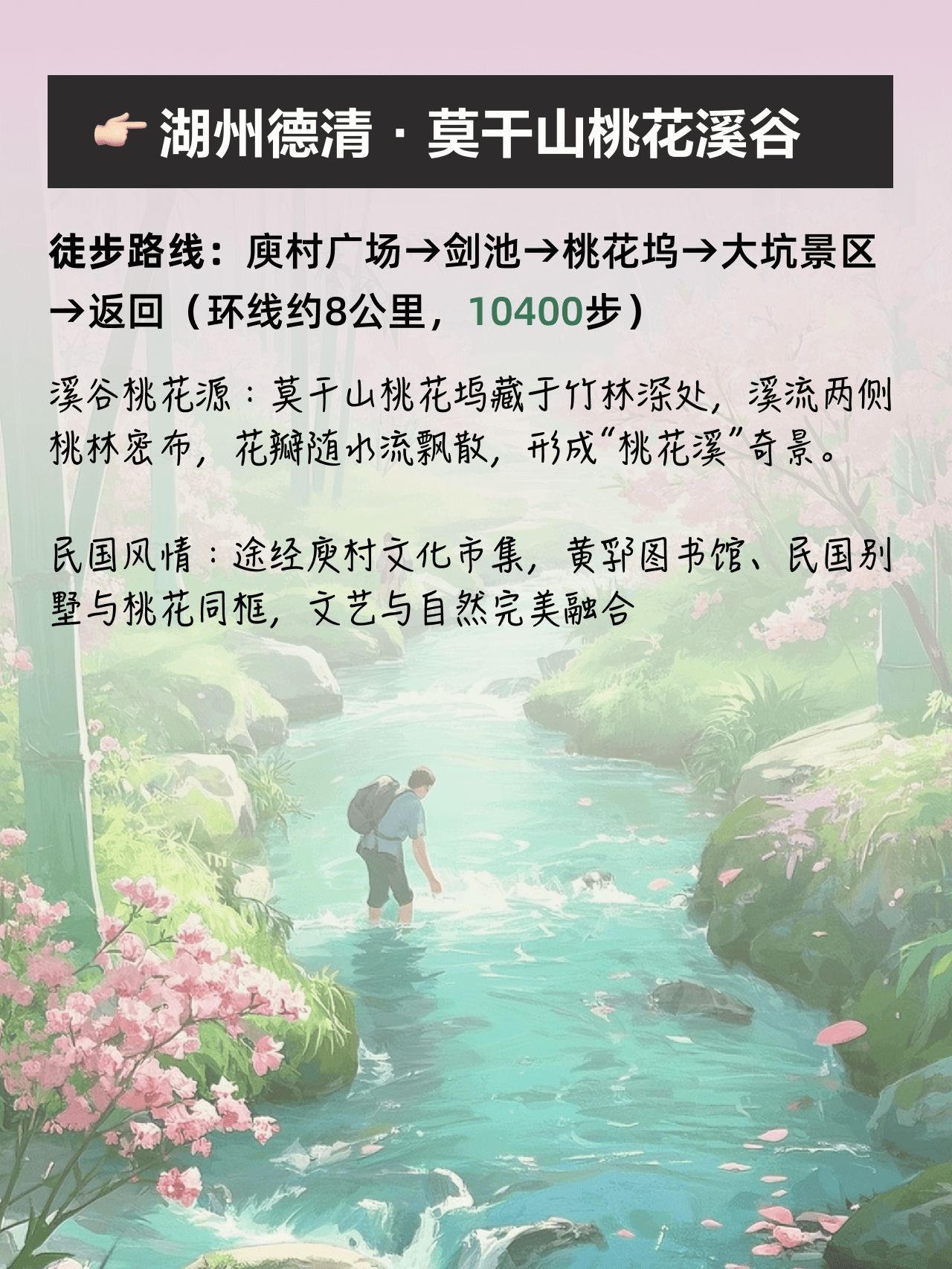 溪谷桃花源:莫干山桃花坞藏于竹林深处,溪流两侧桃林密布,花瓣随水流飘散,形成“桃花溪”奇景。